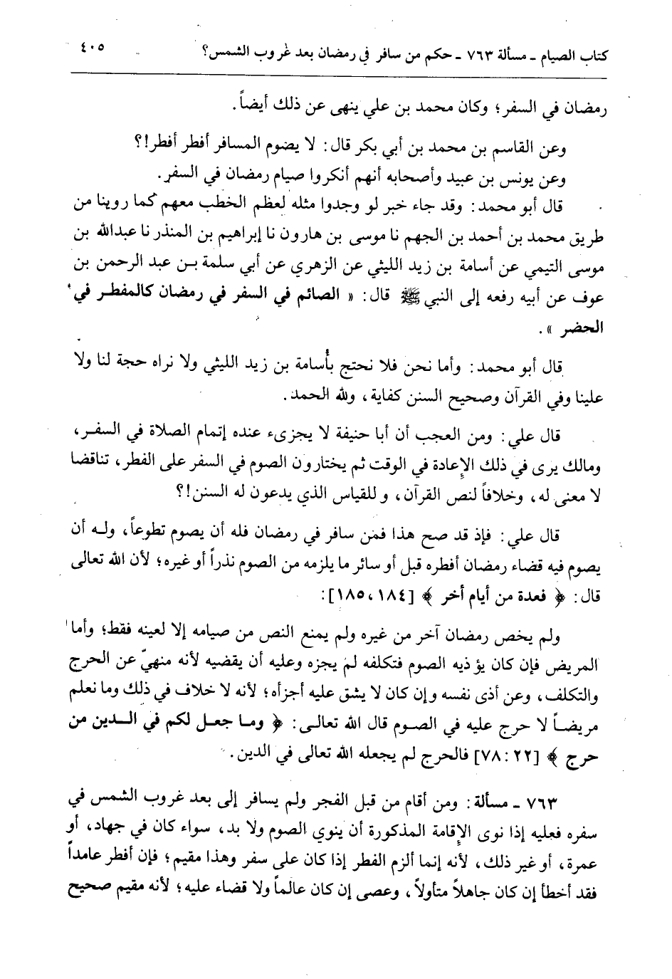 رَمَضَانَ فِي السَّفَرِ؛ وَكَانَ مُحَمَّدُ بْنُ عَلِيٍّ يَنْهَى عَنْ ذَلِكَ أَيْضًا. وَعَنْ الْقَاسِمِ بْنِ مُحَمَّدِ بْنِ أَبِي بَكْرٍ قَالَ: لَا يَصُومُ الْمُسَافِرُ أَفْطِرْ أَفْطِرْ؟ وَعَنْ يُونُسَ بْنِ عُبَيْدٍ وَأَصْحَابِهِ أَنَّهُمْ أَنْكَرُوا صِيَامَ رَمَضَانَ فِي السَّفَرِ. قَالَ أَبُو مُحَمَّدٍ: وَقَدْ جَاءَ خَبَرٌ لَوْ وَجَدُوا مِثْلَهُ لَعَظُمَ الْخَطْبُ مَعَهُمْ كَمَا رُوِّينَا مِنْ طَرِيقِ مُحَمَّدِ بْنِ أَحْمَدَ بْنِ الْجَهْمِ نا مُوسَى بْنُ هَارُونَ نا إبْرَاهِيمُ بْنُ الْمُنْذِرِ نا عَبْدِ اللَّهِ بْنِ مُوسَى التَّيْمِيِّ عَنْ أُسَامَةَ بْنِ زَيْدٍ اللَّيْثِيِّ عَنْ الزُّهْرِيِّ عَنْ أَبِي مَسْلَمَةَ بْنِ عَبْدِ الرَّحْمَنِ بْنِ عَوْفٍ عَنْ أَبِيهِ رَفَعَهُ إلَى النَّبِيِّ - صَلَّى اللَّهُ عَلَيْهِ وَسَلَّمَ - قَالَ: «الصَّائِمُ فِي السَّفَرِ فِي رَمَضَانَ كَالْمُفْطِرِ فِي الْحَضَرِ» . قَالَ أَبُو مُحَمَّدٍ: وَأَمَّا نَحْنُ فَلَا نَحْتَجُّ بِأُسَامَةَ بْنِ زَيْدٍ اللَّيْثِيِّ وَلَا نَرَاهُ حُجَّةً لَنَا وَلَا عَلَيْنَا وَفِي الْقُرْآنِ وَصَحِيحِ السُّنَنِ كِفَايَةٌ، وَلِلَّهِ الْحَمْدُ. قَالَ عَلِيٌّ: وَمِنْ الْعَجَبِ أَنَّ أَبَا حَنِيفَةَ لَا يُجْزِئُ عِنْدَهُ إتْمَامُ الصَّلَاةِ فِي السَّفَرِ، وَمَالِكٌ يَرَى فِي ذَلِكَ الْإِعَادَةَ فِي الْوَقْتِ ثُمَّ يَخْتَارُونَ الصَّوْمَ فِي السَّفَرِ عَلَى الْفِطْرِ، تَنَاقُضًا لَا مَعْنَى لَهُ، وَخِلَافًا لِنَصِّ الْقُرْآنِ، وَلِلْقِيَاسِ الَّذِي يَدَّعُونَ لَهُ السُّنَنَ؟ قَالَ عَلِيٌّ: فَإِذْ قَدْ صَحَّ هَذَا فَمَنْ سَافَرَ فِي رَمَضَانَ فَلَهُ أَنْ يَصُومَ تَطَوُّعًا، وَلَهُ أَنْ يَصُومَ فِيهِ قَضَاءَ رَمَضَانَ أَفْطَرَهُ قَبْلُ أَوْ سَائِرَ مَا يَلْزَمُهُ مِنْ الصَّوْمِ نَذْرًا أَوْ غَيْرَهُ؛ لِأَنَّ اللَّهَ تَعَالَى قَالَ: {فَعِدَّةٌ مِنْ أَيَّامٍ أُخَرَ} [البقرة: 184] : وَلَمْ يَخُصَّ رَمَضَانَ آخَرَ مِنْ غَيْرِهِ وَلَمْ يَمْنَعْ النَّصُّ مِنْ صِيَامِهِ إلَّا لِعَيْنِهِ فَقَطْ؛ وَأَمَّا الْمَرِيضُ فَإِنْ كَانَ يُؤْذِيه الصَّوْمُ فَتَكَلَّفَهُ لَمْ يُجْزِهِ وَعَلَيْهِ أَنْ - يَقْضِيَهُ لِأَنَّهُ مَنْهِيٌّ عَنْ الْحَرَجِ وَالتَّكَلُّفِ، وَعَنْ أَذَى نَفْسِهِ وَإِنْ كَانَ لَا يَشُقُّ عَلَيْهِ أَجْزَأَهُ؛ لِأَنَّهُ لَا خِلَافَ فِي ذَلِكَ وَمَا نَعْلَمُ مَرِيضًا لَا حَرَجَ عَلَيْهِ فِي الصَّوْمِ قَالَ اللَّهُ تَعَالَى: {وَمَا جَعَلَ عَلَيْكُمْ فِي الدِّينِ مِنْ حَرَجٍ} [الحج: 78] فَالْحَرَجُ لَمْ يَجْعَلْهُ اللَّهُ تَعَالَى فِي الدِّينِ.