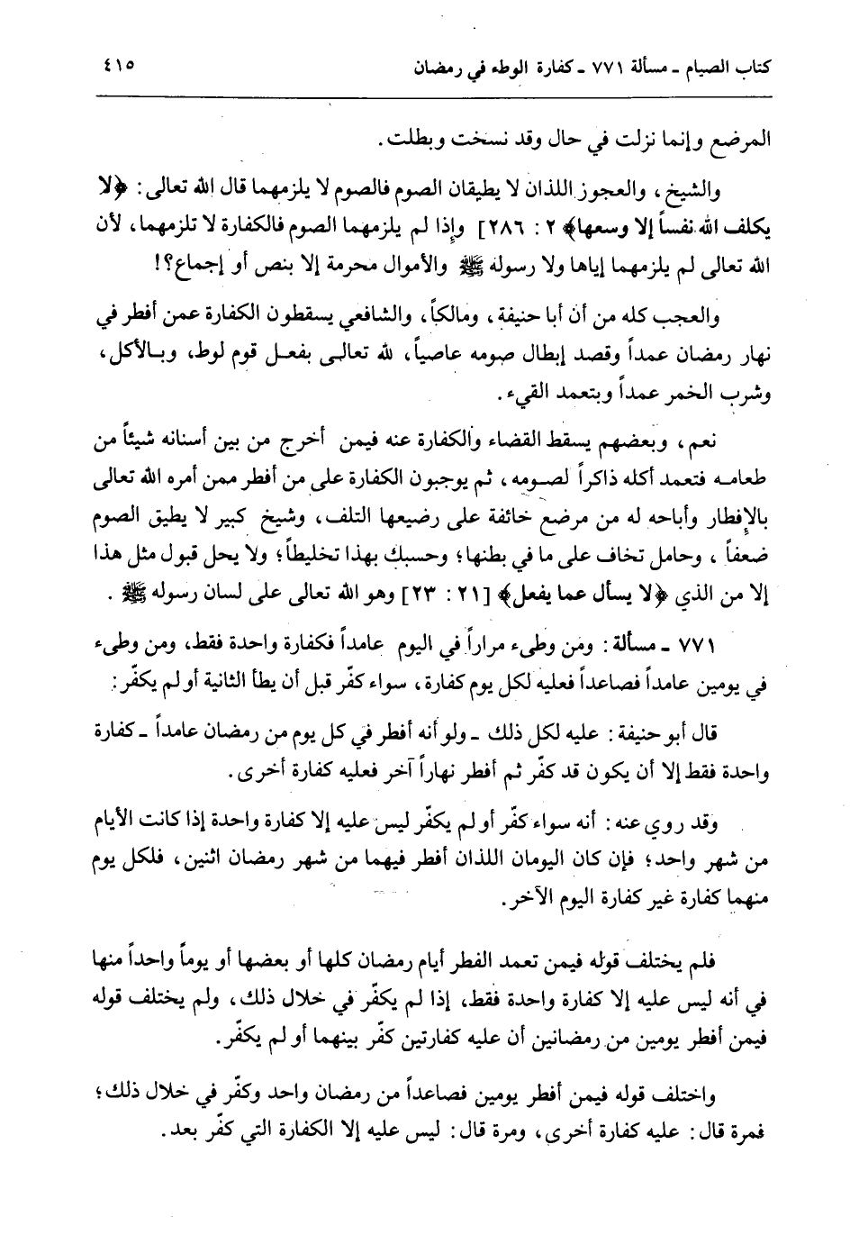 771 - مَسْأَلَةٌ: وَمَنْ وَطِئَ مِرَارًا فِي الْيَوْمِ عَامِدًا فَكَفَّارَةٌ وَاحِدَةٌ فَقَطْ، وَمَنْ وَطِئَ فِي يَوْمَيْنِ عَامِدًا فَصَاعِدًا فَعَلَيْهِ لِكُلِّ يَوْمٍ كَفَّارَةٌ، سَوَاءٌ كَفَّرَ قَبْلَ أَنْ يَطَأَ الثَّانِيَةَ أَوْ لَمْ يُكَفِّرْ: قَالَ أَبُو حَنِيفَةَ: عَلَيْهِ لِكُلِّ ذَلِكَ - وَلَوْ أَنَّهُ أَفْطَرَ فِي كُلِّ يَوْمٍ مِنْ رَمَضَانَ عَامِدًا - كَفَّارَةٌ وَاحِدَةٌ فَقَطْ إلَّا أَنْ يَكُونَ قَدْ كَفَّرَ ثُمَّ أَفْطَرَ نَهَارًا آخَرَ فَعَلَيْهِ كَفَّارَةٌ أُخْرَى. وَقَدْ رُوِيَ عَنْهُ: أَنَّهُ سَوَاءٌ كَفَّرَ أَوْ لَمْ يُكَفِّرْ لَيْسَ عَلَيْهِ إلَّا كَفَّارَةٌ وَاحِدَةٌ إذَا كَانَتْ الْأَيَّامُ مِنْ شَهْرٍ وَاحِدٍ؛ فَإِنْ كَانَ الْيَوْمَانِ اللَّذَانِ أَفْطَرَ فِيهِمَا مِنْ شَهْرِ رَمَضَانَ اثْنَيْنِ، فَلِكُلِّ يَوْمٍ مِنْهُمَا كَفَّارَةٌ غَيْرُ كَفَّارَةِ الْيَوْمِ الْآخَرِ. فَلَمْ يَخْتَلِفْ قَوْلُهُ فِيمَنْ تَعَمَّدَ الْفِطْرَ أَيَّامَ رَمَضَانَ كُلَّهَا أَوْ بَعْضَهَا أَوْ يَوْمًا وَاحِدًا مِنْهَا فِي أَنَّهُ لَيْسَ عَلَيْهِ إلَّا كَفَّارَةٌ وَاحِدَةٌ فَقَطْ، إذَا لَمْ يُكَفِّرْ فِي خِلَالِ ذَلِكَ، وَلَمْ يَخْتَلِفْ قَوْلُهُ فِيمَنْ أَفْطَرَ يَوْمَيْنِ مِنْ رَمَضَانَيْنِ أَنَّ عَلَيْهِ كَفَّارَتَيْنِ كَفَّرَ بَيْنَهُمَا أَوْ لَمْ يُكَفِّرْ.