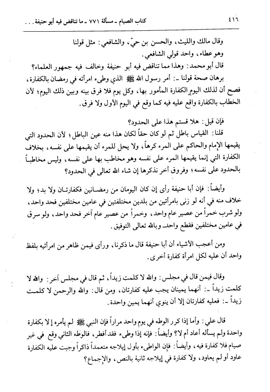 وَقَالَ مَالِكٌ وَاللَّيْثُ، وَالْحَسَنُ بْنُ حَيٍّ، وَالشَّافِعِيُّ: مِثْلَ قَوْلِنَا وَهُوَ عَطَاءٍ، وَأَحَدُ قَوْلُ الشَّافِعِيِّ. قَالَ أَبُو مُحَمَّدٍ: وَهَذَا مِمَّا تَنَاقَضَ فِيهِ أَبُو حَنِيفَةَ وَخَالَفَ فِيهِ جُمْهُورَ الْعُلَمَاءِ. بُرْهَانُ صِحَّةِ قَوْلِنَا -: أَمْرُ رَسُولِ اللَّهِ - صَلَّى اللَّهُ عَلَيْهِ وَسَلَّمَ - الَّذِي وَطِئَ امْرَأَتَهُ فِي رَمَضَانَ بِالْكَفَّارَةِ، فَصَحَّ أَنَّ لِذَلِكَ الْيَوْمِ الْكَفَّارَةُ الْمَأْمُورُ بِهَا، وَكُلُّ يَوْمٍ فَلَا فَرْقَ بَيْنَهُ وَبَيْنَ ذَلِكَ الْيَوْمِ؛ لِأَنَّ الْخِطَابَ بِالْكَفَّارَةِ وَاقِعٌ عَلَيْهِ فِيهِ كَمَا وَقَعَ فِي الْيَوْمِ الْأَوَّلِ وَلَا فَرْقَ. فَإِنْ قِيلَ: هَلَّا قِسْتُمْ هَذَا عَلَى الْحُدُودِ؟ قُلْنَا: الْقِيَاسُ بَاطِلٌ ثُمَّ لَوْ كَانَ حَقًّا لَكَانَ هَذَا مِنْهُ عَيْنَ الْبَاطِلِ؛ لِأَنَّ الْحُدُودَ الَّتِي يُقِيمُهَا الْإِمَامُ وَالْحَاكِمُ عَلَى الْمَرْءِ كُرْهًا، وَلَا يَحِلُّ لِلْمَرْءِ أَنْ يُقِيمَهَا عَلَى نَفْسِهِ، بِخِلَافِ الْكَفَّارَةِ الَّتِي إنَّمَا يُقِيمُهَا الْمَرْءُ عَلَى نَفْسِهِ وَهُوَ مُخَاطَبٌ بِهَا عَلَى نَفْسِهِ، وَلَيْسَ مُخَاطَبًا بِالْحُدُودِ عَلَى نَفْسِهِ؛ وَفُرُوقٌ أُخَرُ نَذْكُرُهَا إنْ شَاءَ اللَّهُ تَعَالَى فِي الْحُدُودِ؟ وَأَيْضًا: فَإِنَّ أَبَا حَنِيفَةَ رَأَى إنْ كَانَ الْيَوْمَانِ مِنْ رَمَضَانَيْنِ فَكَفَّارَتَانِ وَلَا بُدَّ؛ وَلَا خِلَافَ مِنْهُ فِي أَنَّهُ لَوْ زَنَى بِامْرَأَتَيْنِ مِنْ بَلَدَيْنِ مُخْتَلِفَتَيْنِ فِي عَامَيْنِ مُخْتَلِفِينَ فَحَدٌّ وَاحِدٌ، وَلَوْ شَرِبَ خَمْرًا مِنْ عَصِيرِ عَامٍ وَاحِدٍ، وَخَمْرًا مِنْ عَصِيرِ عَامٍ آخَرَ فَحَدٌّ وَاحِدٌ، وَلَوْ سَرَقَ فِي عَامَيْنِ مُخْتَلِفَيْنِ فَقَطْعٌ وَاحِدٌ - وَبِاَللَّهِ تَعَالَى التَّوْفِيقُ.