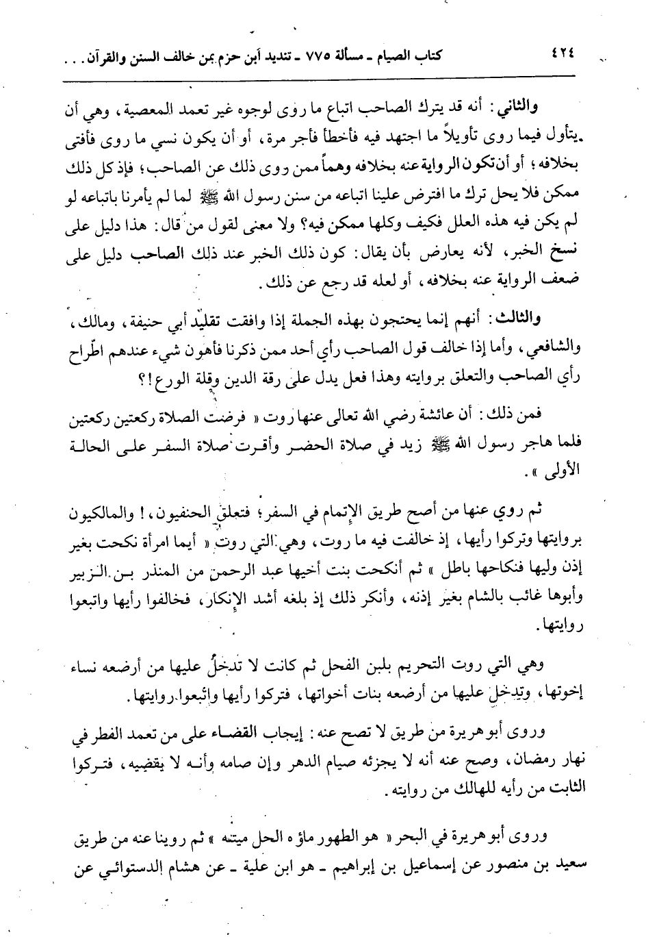 وَالثَّالِثُ: أَنَّهُمْ إنَّمَا يَحْتَجُّونَ بِهَذِهِ الْجُمْلَةِ إذَا وَافَقَتْ تَقْلِيدَ أَبِي حَنِيفَةَ، وَمَالِكٍ، وَالشَّافِعِيِّ، وَأَمَّا إذَا خَالَفَ قَوْلُ الصَّاحِبِ رَأْيَ أَحَدٍ مِمَّنْ ذَكَرْنَا فَأَهْوَنُ شَيْءٍ عِنْدَهُمْ إطْرَاحُ رَأْيِ الصَّاحِبِ وَالتَّعَلُّقُ بِرِوَايَتِهِ وَهَذَا فِعْلٌ يَدُلُّ عَلَى رِقَّةِ الدِّينِ وَقِلَّةِ الْوَرَعِ؟ فَمِنْ ذَلِكَ: أَنَّ عَائِشَةَ - رَضِيَ اللَّهُ تَعَالَى عَنْهَا - رَوَتْ «فُرِضَتْ الصَّلَاةُ رَكْعَتَيْنِ رَكْعَتَيْنِ فَلَمَّا هَاجَرَ رَسُولُ اللَّهِ - صَلَّى اللَّهُ عَلَيْهِ وَسَلَّمَ - زِيدَ فِي صَلَاةِ الْحَضَرِ وَأُقِرَّتْ صَلَاةُ السَّفَرِ عَلَى الْحَالَةِ الْأُولَى» . ثُمَّ رُوِيَ عَنْهَا مِنْ أَصَحِّ طَرِيقِ الْإِتْمَامِ فِي السَّفَرِ؛ فَتَعَلَّقَ الْحَنَفِيُّونَ، وَالْمَالِكِيُّونَ بِرِوَايَتِهَا وَتَرَكُوا رَأْيَهَا، إذْ خَالَفَتْ فِيهِ مَا رَوَتْ، وَهِيَ الَّتِي رَوَتْ «أَيُّمَا امْرَأَةٍ نَكَحَتْ بِغَيْرِ إذْنِ وَلِيِّهَا فَنِكَاحُهَا بَاطِلٍ» ثُمَّ أَنْكَحَتْ بِنْتَ أَخِيهَا عَبْدِ الرَّحْمَنِ الْمُنْذِرِ بْنِ الزُّبَيْرِ وَأَبُوهَا غَائِبٌ بِالشَّامِ بِغَيْرِ إذْنِهِ، وَأَنْكَرَ ذَلِكَ إذْ بَلَغَهُ أَشَدَّ الْإِنْكَارِ، فَخَالَفُوا رَأْيَهَا وَاتَّبَعُوا رِوَايَتَهَا. وَهِيَ الَّتِي رَوَتْ التَّحْرِيمَ بِلَبَنِ الْفَحْلِ ثُمَّ كَانَتْ لَا - تُدْخِلُ عَلَيْهَا مَنْ أَرْضَعَهُ نِسَاءُ إخْوَتِهَا، - وَتُدْخِلُ عَلَيْهَا مَنْ أَرْضَعَهُ بَنَاتُ أَخَوَاتِهَا، فَتَرَكُوا رَأْيَهَا وَاتَّبَعُوا رِوَايَتَهَا. وَرَوَى أَبُو هُرَيْرَةَ مِنْ طَرِيقٍ لَا تَصِحُّ عَنْهُ: إيجَابَ الْقَضَاءِ عَلَى مَنْ تَعَمَّدَ الْفِطْرَ فِي نَهَارِ رَمَضَانَ، وَصَحَّ عَنْهُ أَنَّهُ لَا يُجْزِئُهُ صِيَامُ الدَّهْرِ وَإِنْ صَامَهُ وَأَنَّهُ لَا يَقْضِيهِ، فَتَرَكُوا الثَّابِتَ مِنْ رَأْيِهِ لِلْهَالِكِ مِنْ رِوَايَتِهِ. وَرَوَى أَبُو هُرَيْرَةَ فِي الْبَحْرِ «هُوَ الطَّهُورُ مَاؤُهُ الْحِلُّ مَيْتَتُهُ» ثُمَّ رُوِّينَا عَنْهُ مِنْ طَرِيقِ سَعِيدِ بْنِ مَنْصُورٍ عَنْ إسْمَاعِيلَ بْنِ إبْرَاهِيمَ هُوَ ابْنُ عُلَيَّةَ - عَنْ هِشَامٍ الدَّسْتُوَائِيِّ عَنْ