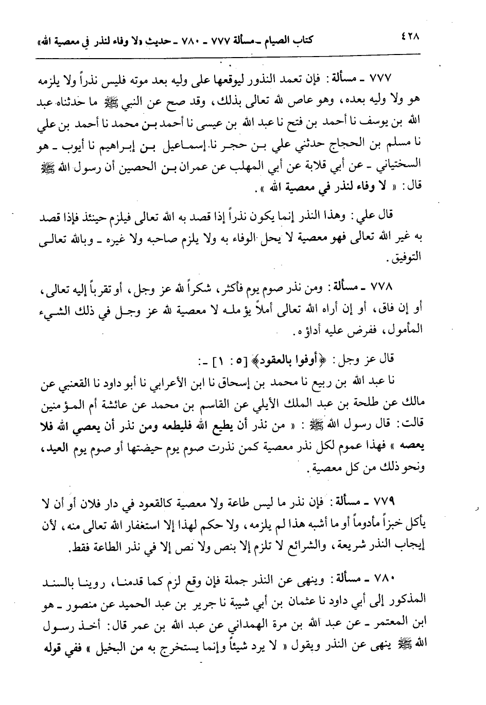 780 - مَسْأَلَةٌ: وَيُنْهَى عَنْ النَّذْرِ جُمْلَةً فَإِنْ وَقَعَ لَزِمَ كَمَا قَدَّمْنَا، رُوِّينَا بِالسَّنَدِ الْمَذْكُورِ إلَى أَبِي دَاوُد نا عُثْمَانُ بْنُ أَبِي شَيْبَةَ نا جَرِيرُ بْنُ عَبْدِ الْحَمِيدِ عَنْ مَنْصُورٍ هُوَ ابْنُ الْمُعْتَمِرِ - عَنْ عَبْدِ اللَّهِ بْنِ مُرَّةَ الْهَمْدَانِيِّ عَنْ عَبْدِ اللَّهِ بْنِ عُمَرَ قَالَ: «أَخَذَ رَسُولُ اللَّهِ - صَلَّى اللَّهُ عَلَيْهِ وَسَلَّمَ - يَنْهَى عَنْ النَّذْرِ وَيَقُولُ لَا يَرُدُّ شَيْئًا وَإِنَّمَا يُسْتَخْرَجُ بِهِ مِنْ الْبَخِيلِ» فَفِي قَوْلِهِ