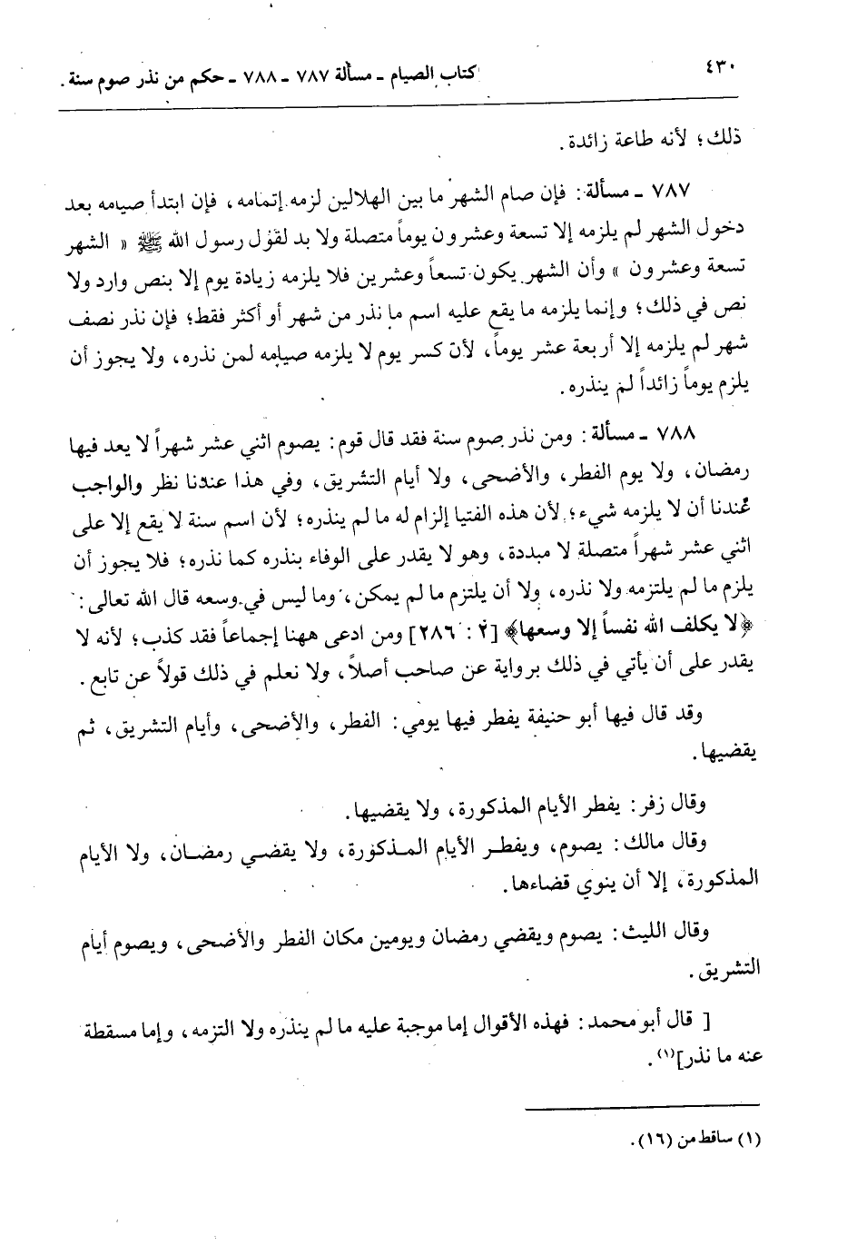 788 - مَسْأَلَةٌ: وَمَنْ نَذَرَ صَوْمَ سَنَةٍ فَقَدْ قَالَ قَوْمٌ: يَصُومُ اثْنَيْ عَشَرَ شَهْرًا لَا يَعُدُّ فِيهَا رَمَضَانَ، وَلَا يَوْمَ الْفِطْرِ، وَالْأَضْحَى، وَلَا أَيَّامَ التَّشْرِيقِ، وَفِي هَذَا عِنْدَنَا نَظَرٌ وَالْوَاجِبُ عِنْدَنَا أَنْ لَا يَلْزَمَهُ شَيْءٌ؛ لِأَنَّ هَذِهِ الْفُتْيَا إلْزَامٌ لَهُ مَا لَمْ يَنْذِرْهُ؛ لِأَنَّ اسْمَ سَنَةٍ لَا يَقَعُ إلَّا عَلَى اثْنَيْ عَشَرَ شَهْرًا مُتَّصِلَةٍ لَا مُبَدَّدَةٍ، وَهُوَ لَا يَقْدِرُ عَلَى الْوَفَاءِ بِنَذْرِهِ كَمَا نَذَرَهُ؛ فَلَا يَجُوزُ أَنْ يُلْزَمَ مَا لَمْ يَلْتَزِمْهُ وَلَا نَذَرَهُ، وَلَا أَنْ يَلْتَزِمَ مَا لَمْ يُمْكِنْ، وَمَا لَيْسَ فِي وُسْعِهِ قَالَ اللَّهُ تَعَالَى: {لا يُكَلِّفُ اللَّهُ نَفْسًا إِلا وُسْعَهَا} [البقرة: 286] وَمَنْ ادَّعَى هَاهُنَا إجْمَاعًا فَقَدْ كَذَبَ؛ لِأَنَّهُ لَا يَقْدِرُ عَلَى أَنْ يَأْتِيَ فِي ذَلِكَ بِرِوَايَةٍ عَنْ صَاحِبٍ أَصْلًا، وَلَا نَعْلَمُ فِي ذَلِكَ قَوْلًا عَنْ تَابِعٍ. وَقَدْ قَالَ فِيهَا أَبُو حَنِيفَةَ يُفْطِرُ فِيهَا يَوْمَيْ الْفِطْرِ وَالْأَضْحَى وَأَيَّامَ التَّشْرِيقِ، ثُمَّ يَقْضِيهَا. وَقَالَ زُفَرُ: يُفْطِرُ الْأَيَّامَ الْمَذْكُورَةَ، وَلَا يَقْضِيهَا. وَقَالَ مَالِكٌ: يَصُومُ، وَيُفْطِرُ الْأَيَّامَ الْمَذْكُورَةَ، وَلَا يَقْضِي رَمَضَانَ، وَلَا الْأَيَّامَ الْمَذْكُورَةَ، إلَّا أَنْ يَنْوِيَ قَضَاءَهَا. وَقَالَ اللَّيْثُ: يَصُومُ وَيَقْضِي رَمَضَانَ وَيَوْمَيْنِ مَكَانَ الْفِطْرِ وَالْأَضْحَى، وَيَصُومُ أَيَّامَ التَّشْرِيقِ. [قَالَ أَبُو مُحَمَّدٍ: فَهَذِهِ الْأَقْوَالُ إمَّا مُوجِبَةٌ عَلَيْهِ مَا لَمْ يَنْذِرْهُ وَلَا الْتَزَمَهُ، وَإِمَّا مُسْقِطَةٌ عَنْهُ مَا نَذَرَ] .