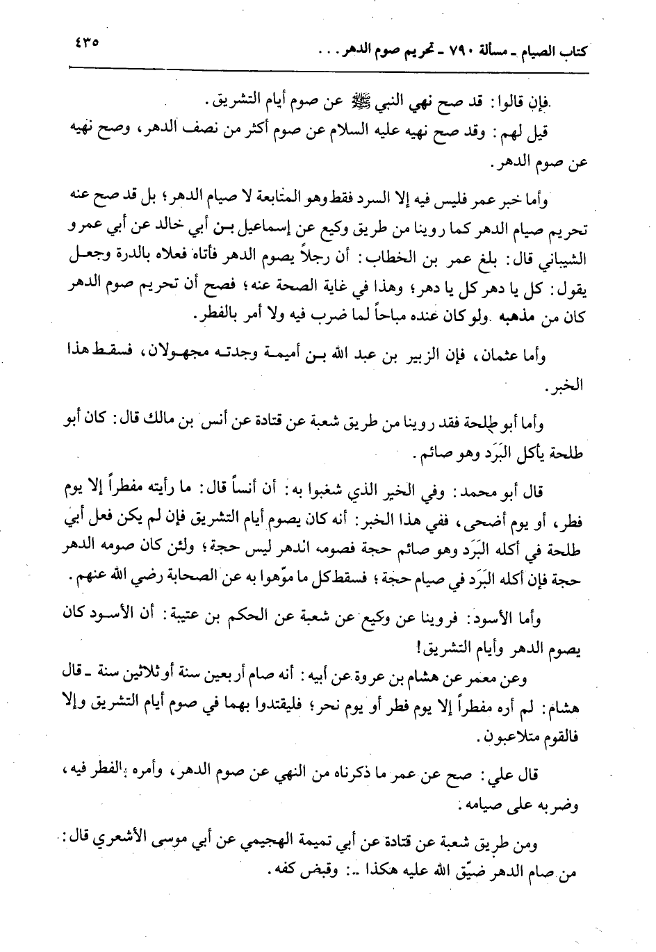 فَإِنْ قَالُوا: قَدْ صَحَّ نَهْيُ النَّبِيِّ - صَلَّى اللَّهُ عَلَيْهِ وَسَلَّمَ - عَنْ صَوْمِ أَيَّامِ التَّشْرِيقِ. قِيلَ لَهُمْ: وَقَدْ صَحَّ نَهْيُهُ - عَلَيْهِ السَّلَامُ - عَنْ صَوْمِ أَكْثَرَ مِنْ نِصْفِ الدَّهْرِ، وَصَحَّ نَهْيُهُ عَنْ صَوْمِ الدَّهْرِ. وَأَمَّا خَبَرُ عُمَرَ فَلَيْسَ فِيهِ إلَّا السَّرْدُ فَقَطْ وَهُوَ الْمُتَابَعَةُ لَا صِيَامُ الدَّهْرِ؛ بَلْ قَدْ صَحَّ عَنْهُ تَحْرِيمُ صِيَامِ الدَّهْرِ كَمَا رُوِّينَا مِنْ طَرِيقِ وَكِيعٍ عَنْ إسْمَاعِيلَ بْنِ أَبِي خَالِدٍ عَنْ أَبِي عَمْرٍو الشَّيْبَانِيِّ قَالَ: بَلَغَ عُمَرُ بْنُ الْخَطَّابِ: أَنَّ رَجُلًا يَصُومُ الدَّهْرَ فَأَتَاهُ فَعَلَاهُ بِالدِّرَّةِ وَجَعَلَ يَقُولُ: كُلْ يَا دَهْرُ كُلْ يَا دَهْرُ؛ وَهَذَا فِي غَايَةِ الصِّحَّةِ عَنْهُ؛ فَصَحَّ أَنَّ تَحْرِيمَ صَوْمِ الدَّهْرِ كَانَ مِنْ مَذْهَبِهِ وَلَوْ كَانَ عِنْدَهُ مُبَاحًا لَمَا ضَرَبَ فِيهِ وَلَا أَمَرَ بِالْفِطْرِ.