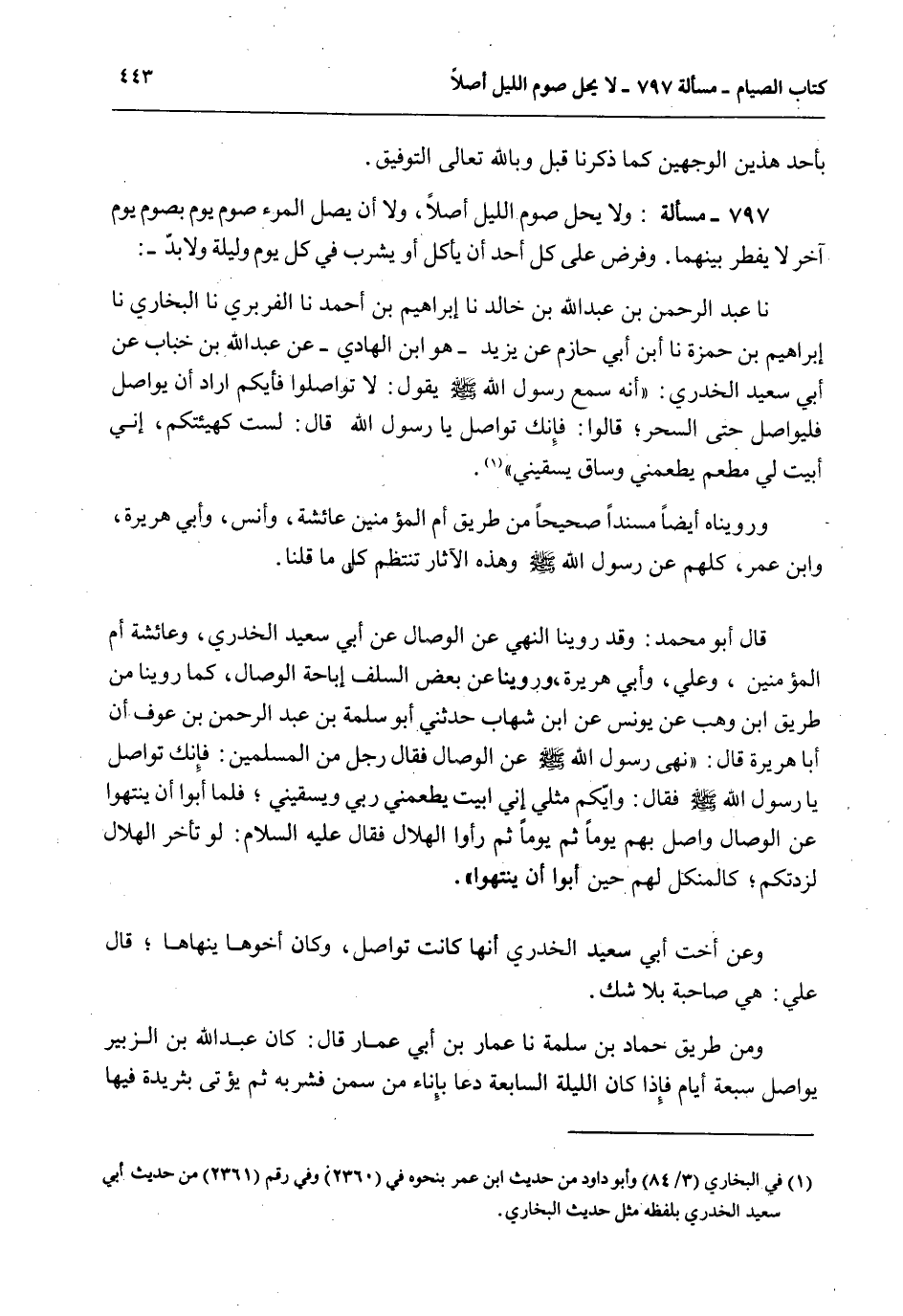 797 - مَسْأَلَةٌ: وَلَا يَحِلُّ صَوْمُ اللَّيْلِ أَصْلًا، وَلَا أَنْ يَصِلَ الْمَرْءُ صَوْمَ يَوْمٍ بِصَوْمِ يَوْمٍ آخَرَ لَا يُفْطِرُ بَيْنَهُمَا، وَفُرِضَ عَلَى كُلِّ أَحَدٍ أَنْ يَأْكُلَ أَوْ يَشْرَبَ فِي كُلِّ يَوْمٍ وَلَيْلَةٍ وَلَا بُدَّ. نَا عَبْدُ الرَّحْمَنِ بْنُ عَبْدِ اللَّهِ بْنِ خَالِدٍ نَا إبْرَاهِيمُ بْنُ أَحْمَدَ نَا الْفَرَبْرِيُّ نَا الْبُخَارِيُّ نَا إبْرَاهِيمُ بْنُ حَمْزَةَ نَا ابْنُ أَبِي حَازِمٍ عَنْ يَزِيدَ هُوَ ابْنُ الْهَادِي - عَنْ عَبْدِ اللَّهِ بْنِ خَبَّابٍ عَنْ أَبِي سَعِيدٍ الْخُدْرِيِّ: " أَنَّهُ سَمِعَ رَسُولَ اللَّهِ - صَلَّى اللَّهُ عَلَيْهِ وَسَلَّمَ - يَقُولُ: «لَا تُوَاصِلُوا فَأَيُّكُمْ أَرَادَ أَنْ يُوَاصِلَ فَلْيُوَاصِلْ حَتَّى السَّحَرِ، قَالُوا: فَإِنَّكَ تُوَاصِلُ يَا رَسُولَ اللَّهِ قَالَ: لَسْتُ كَهَيْئَتِكُمْ، إنِّي أَبِيتُ لِي مُطْعِمٌ يُطْعِمُنِي وَسَاقٍ يَسْقِينِي» . وَرُوِّينَاهُ أَيْضًا مُسْنَدًا صَحِيحًا مِنْ طَرِيقِ أُمِّ الْمُؤْمِنِينَ عَائِشَةَ، وَأَنَسٍ، وَأَبِي هُرَيْرَةَ، وَابْنِ عُمَرَ، كُلِّهِمْ عَنْ رَسُولِ اللَّهِ - صَلَّى اللَّهُ عَلَيْهِ وَسَلَّمَ - وَهَذِهِ الْآثَارُ تَنْتَظِمُ كُلَّ مَا قُلْنَا. قَالَ أَبُو مُحَمَّدٍ: وَقَدْ رُوِّينَا النَّهْيَ عَنْ الْوِصَالِ عَنْ أَبِي سَعِيدٍ الْخُدْرِيِّ، وَعَائِشَةَ أُمِّ الْمُؤْمِنِينَ، وَعَلِيٍّ، وَأَبِي هُرَيْرَةَ، وَرُوِّينَا عَنْ بَعْضِ السَّلَفِ إبَاحَةَ الْوِصَالِ، كَمَا رُوِّينَا مِنْ طَرِيقِ ابْنِ وَهْبٍ عَنْ يُونُسَ عَنْ ابْنِ شِهَابٍ حَدَّثَنِي أَبُو سَلَمَةَ بْنُ عَبْدِ الرَّحْمَنِ بْنِ عَوْفٍ أَنَّ أَبَا هُرَيْرَةَ قَالَ: «نَهَى رَسُولُ اللَّهِ - صَلَّى اللَّهُ عَلَيْهِ وَسَلَّمَ - عَنْ الْوِصَالِ فَقَالَ رَجُلٌ مِنْ الْمُسْلِمِينَ: فَإِنَّكَ تُوَاصِلُ يَا رَسُولَ اللَّهِ - صَلَّى اللَّهُ عَلَيْهِ وَسَلَّمَ - فَقَالَ: وَأَيُّكُمْ مِثْلِي إنِّي أَبِيتُ يُطْعِمُنِي رَبِّي وَيَسْقِينِي؛ فَلَمَّا أَبَوْا أَنْ يَنْتَهُوا عَنْ الْوِصَالِ وَاصَلَ بِهِمْ يَوْمًا ثُمَّ يَوْمًا ثُمَّ رَأَوْا الْهِلَالَ فَقَالَ - عَلَيْهِ السَّلَامُ -: لَوْ تَأَخَّرَ الْهِلَالُ لَزِدْتُكُمْ؛ كَالْمُنَكِّلِ لَهُمْ حِينَ أَبَوْا أَنْ يَنْتَهُوا» . وَعَنْ أُخْتِ أَبِي سَعِيدٍ الْخُدْرِيِّ أَنَّهَا كَانَتْ تُوَاصِلُ، وَكَانَ أَخُوهَا يَنْهَاهَا؛ قَالَ عَلِيٌّ: هِيَ صَاحِبَةٌ بِلَا شَكٍّ. وَمِنْ طَرِيقِ حَمَّادِ بْنِ سَلَمَةَ نَا عَمَّارُ بْنُ أَبِي عَمَّارٍ قَالَ: كَانَ عَبْدُ اللَّهِ بْنُ الزُّبَيْرِ يُوَاصِلُ سَبْعَةَ أَيَّامٍ فَإِذَا كَانَ اللَّيْلَةَ السَّابِعَةَ دَعَا بِإِنَاءٍ مِنْ سَمْنٍ فَشَرِبَهُ ثُمَّ يُؤْتَى بِثَرِيدَةٍ فِيهَا