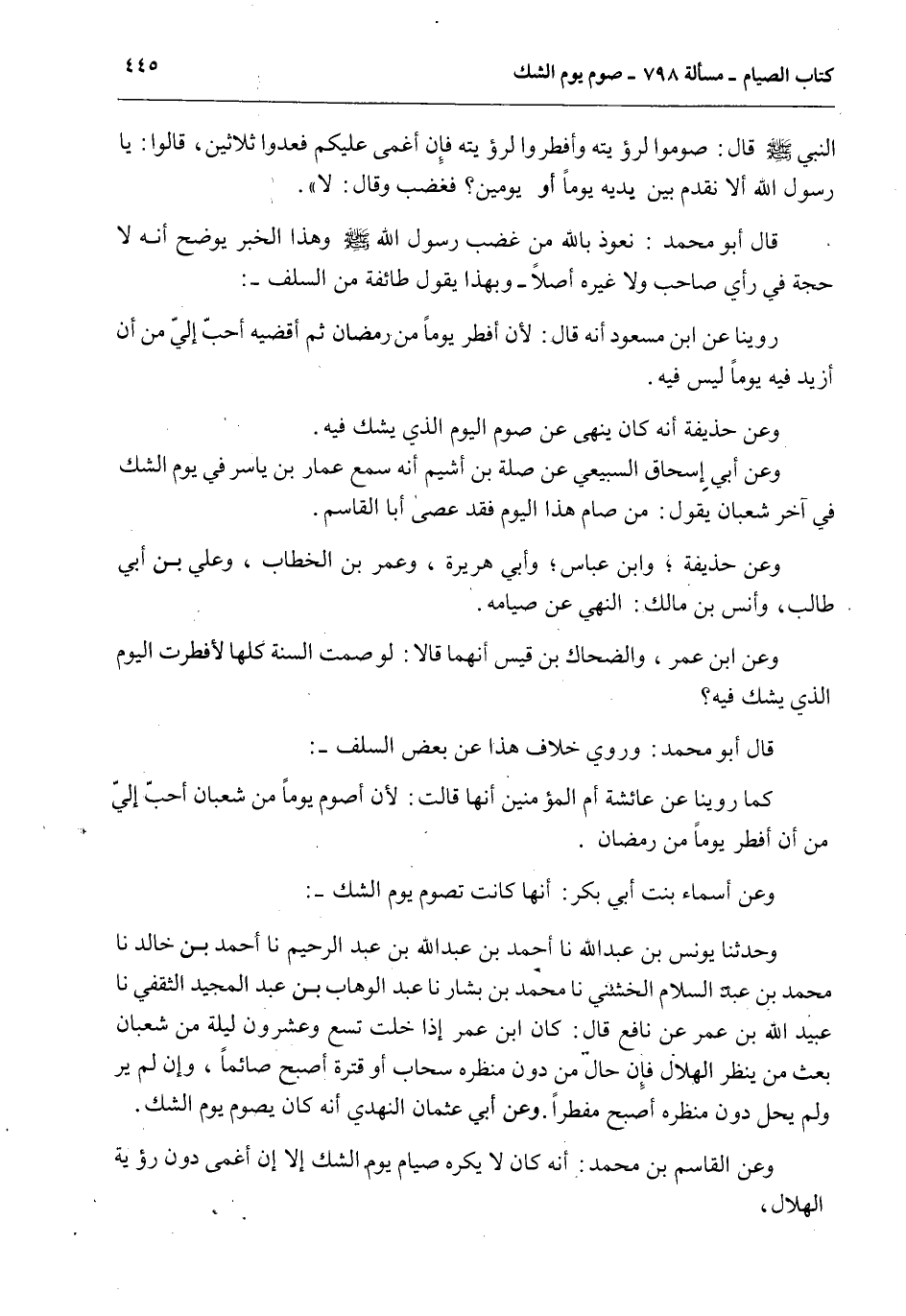 النَّبِيَّ - صَلَّى اللَّهُ عَلَيْهِ وَسَلَّمَ - قَالَ: «صُومُوا لِرُؤْيَتِهِ وَأَفْطِرُوا لِرُؤْيَتِهِ فَإِنْ أُغْمِيَ عَلَيْكُمْ فَعُدُّوا ثَلَاثِينَ، قَالُوا: يَا رَسُولَ اللَّهِ أَلَا نُقَدِّمُ بَيْنَ يَدَيْهِ يَوْمًا أَوْ يَوْمَيْنِ؟ فَغَضِبَ وَقَالَ: لَا» . قَالَ أَبُو مُحَمَّدٍ: نَعُوذُ بِاَللَّهِ مِنْ غَضَبِ رَسُولِ اللَّهِ - صَلَّى اللَّهُ عَلَيْهِ وَسَلَّمَ - هَذَا الْخَبَرُ يُوَضِّحُ أَنَّهُ لَا حُجَّةَ فِي أَيِّ صَاحِبٍ وَلَا غَيْرِهِ أَصْلًا - وَبِهَذَا يَقُولُ طَائِفَةٌ مِنْ السَّلَفِ -: رُوِّينَا عَنْ ابْنِ مَسْعُودٍ أَنَّهُ قَالَ: لَأَنْ أُفْطِرَ يَوْمًا مِنْ رَمَضَانَ ثُمَّ أَقْضِيَهُ أَحَبُّ إلَيَّ مِنْ أَنْ أَزِيدَ فِيهِ يَوْمًا لَيْسَ فِيهِ. وَعَنْ حُذَيْفَةَ أَنَّهُ كَانَ يَنْهَى عَنْ صَوْمِ الْيَوْمِ الَّذِي يَشُكُّ فِيهِ. وَعَنْ أَبِي إِسْحَاقَ السَّبِيعِيِّ عَنْ صِلَةَ بْنِ أَشْيَمَ أَنَّهُ سَمِعَ عَمَّارَ بْنَ يَاسِرٍ فِي يَوْمِ الشَّكِّ فِي آخِرِ شَعْبَانَ يَقُولُ: مَنْ صَامَ هَذَا الْيَوْمَ فَقَدْ عَصَى أَبَا الْقَاسِمِ. وَعَنْ حُذَيْفَةَ؛ وَابْنِ عَبَّاسٍ؛ وَأَبِي هُرَيْرَةَ، وَعُمَرَ بْنِ الْخَطَّابِ، وَعَلِيِّ بْنِ أَبِي طَالِبٍ، وَأَنَسِ بْنِ مَالِكٍ: النَّهْيُ عَنْ صِيَامِهِ. وَعَنْ ابْنِ عُمَرَ، وَالضَّحَّاكِ بْنِ قَيْسٍ أَنَّهُمَا قَالَا: لَوْ صُمْت السَّنَةَ كُلَّهَا لَأَفْطَرْت الْيَوْمَ الَّذِي يُشَكُّ فِيهِ؟ قَالَ أَبُو مُحَمَّدٍ: وَرُوِيَ خِلَافُ هَذَا عَنْ بَعْضِ السَّلَفِ -: كَمَا رُوِّينَا عَنْ عَائِشَةَ أُمِّ الْمُؤْمِنِينَ أَنَّهَا قَالَتْ: لَأَنْ أَصُومَ يَوْمًا مِنْ شَعْبَانَ أَحَبُّ إلَيَّ مِنْ أَنْ أُفْطِرَ يَوْمًا مِنْ رَمَضَانَ. وَعَنْ أَسْمَاءَ بِنْتِ أَبِي بَكْرٍ: أَنَّهَا كَانَتْ تَصُومُ يَوْمَ الشَّكِّ -: وَحَدَّثَنَا يُونُسُ بْنُ عَبْدِ اللَّهِ نَا أَحْمَدُ بْنُ عَبْدِ اللَّهِ بْنِ عَبْدِ الرَّحِيمِ نَا أَحْمَدُ بْنُ خَالِدٍ نَا مُحَمَّدُ بْنُ عَبْدِ السَّلَامِ الْخُشَنِيُّ نَا مُحَمَّدُ بْنُ بَشَّارٍ نَا عَبْدُ الْوَهَّابِ بْنُ عَبْدِ الْمَجِيدِ الثَّقَفِيُّ نَا عُبَيْدُ اللَّهِ بْنُ عُمَرَ عَنْ نَافِعٍ قَالَ: كَانَ ابْنُ عُمَرَ إذَا خَلَتْ تِسْعٌ وَعِشْرُونَ لَيْلَةً مِنْ شَعْبَانَ بَعَثَ مَنْ يَنْظُرُ الْهِلَالَ فَإِنْ حَالَ مِنْ دُونِ مَنْظَرِهِ سَحَابٌ أَوْ قَتَرَةٌ أَصْبَحَ صَائِمًا، وَإِنْ لَمْ يَرَ وَلَمْ يَحُلْ دُونَ مَنْظَرِهِ أَصْبَحَ مُفْطِرًا. وَعَنْ أَبِي عُثْمَانَ النَّهْدِيِّ أَنَّهُ كَانَ يَصُومُ يَوْمَ الشَّكِّ. وَعَنْ الْقَاسِمِ بْنِ مُحَمَّدٍ: أَنَّهُ كَانَ لَا يَكْرَهُ صِيَامَ يَوْمِ الشَّكِّ إلَّا إنْ أُغْمِيَ دُونَ رُؤْيَةِ الْهِلَالِ،