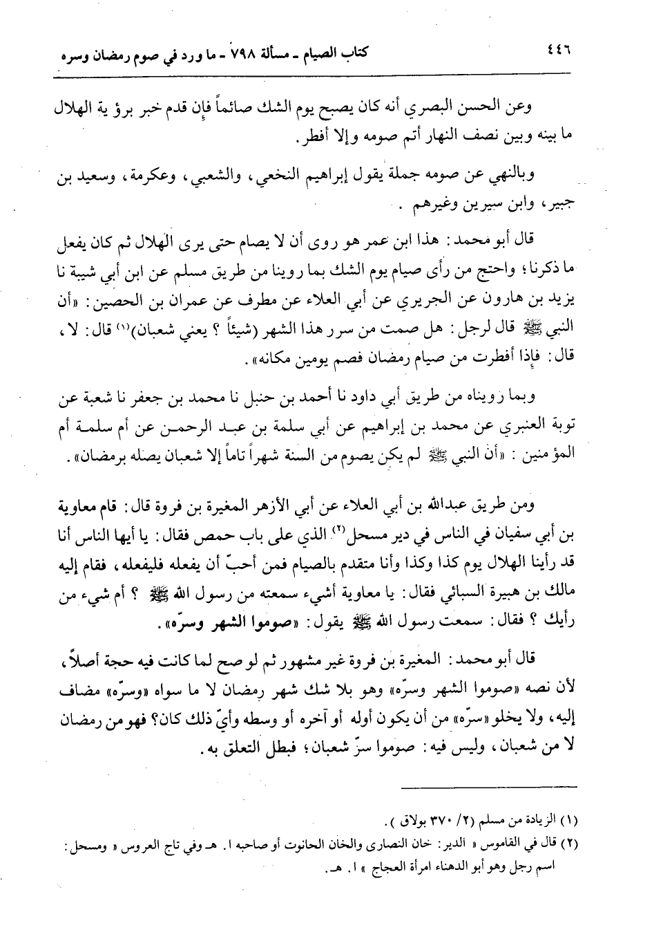 وَمِنْ طَرِيقِ عَبْدِ اللَّهِ بْنِ أَبِي الْعَلَاءِ عَنْ أَبِي الْأَزْهَرِ الْمُغِيرَةِ بْنِ فَرْوَةَ قَالَ: قَامَ مُعَاوِيَةُ بْنُ أَبِي سُفْيَانَ فِي النَّاسِ فِي دَيْرِ مِسْحَلٍ الَّذِي عَلَى بَابِ حِمْصٍ فَقَالَ: يَا أَيُّهَا النَّاسُ إنَّا قَدْ رَأَيْنَا الْهِلَالَ يَوْمَ كَذَا وَكَذَا وَأَنَّا مُتَقَدِّمٌ بِالصِّيَامِ فَمَنْ أَحَبَّ أَنْ يَفْعَلَهُ فَلْيَفْعَلْهُ، فَقَامَ إلَيْهِ مَالِكُ بْنُ هُبَيْرَةَ السَّبَائِيُّ فَقَالَ: يَا مُعَاوِيَةُ أَشَيْءٌ سَمِعْتَهُ مِنْ رَسُولِ اللَّهِ - صَلَّى اللَّهُ عَلَيْهِ وَسَلَّمَ -؟ أَمْ شَيْءٌ مِنْ رَأْيِكَ؟ فَقَالَ: سَمِعْت رَسُولَ اللَّهِ - صَلَّى اللَّهُ عَلَيْهِ وَسَلَّمَ - يَقُولُ: «صُومُوا الشَّهْرَ وَسِرَّهُ» . قَالَ أَبُو مُحَمَّدٍ: الْمُغِيرَةُ بْنُ فَرْوَةٍ غَيْرُ مَشْهُورٍ ثُمَّ لَوْ صَحَّ لَمَا كَانَتْ فِيهِ حُجَّةٌ أَصْلًا، لِأَنَّ نَصَّهُ «صُومُوا الشَّهْرَ وَسِرَّهُ» وَهُوَ بِلَا شَكٍّ شَهْرُ رَمَضَانَ لَا مَا سِوَاهُ " وَسِرَّهُ " مُضَافٌ إلَيْهِ، وَلَا يَخْلُو " سِرُّهُ " مِنْ أَنْ يَكُونَ أَوَّلَهُ أَوْ آخِرَهُ أَوْ وَسَطَهُ وَأَيَّ ذَلِكَ كَانَ؟ فَهُوَ مِنْ رَمَضَانَ لَا مِنْ شَعْبَانَ، وَلَيْسَ فِيهِ: صُومُوا سِرَّ شَعْبَانَ؛ فَبَطَلَ التَّعَلُّقُ بِهِ.
