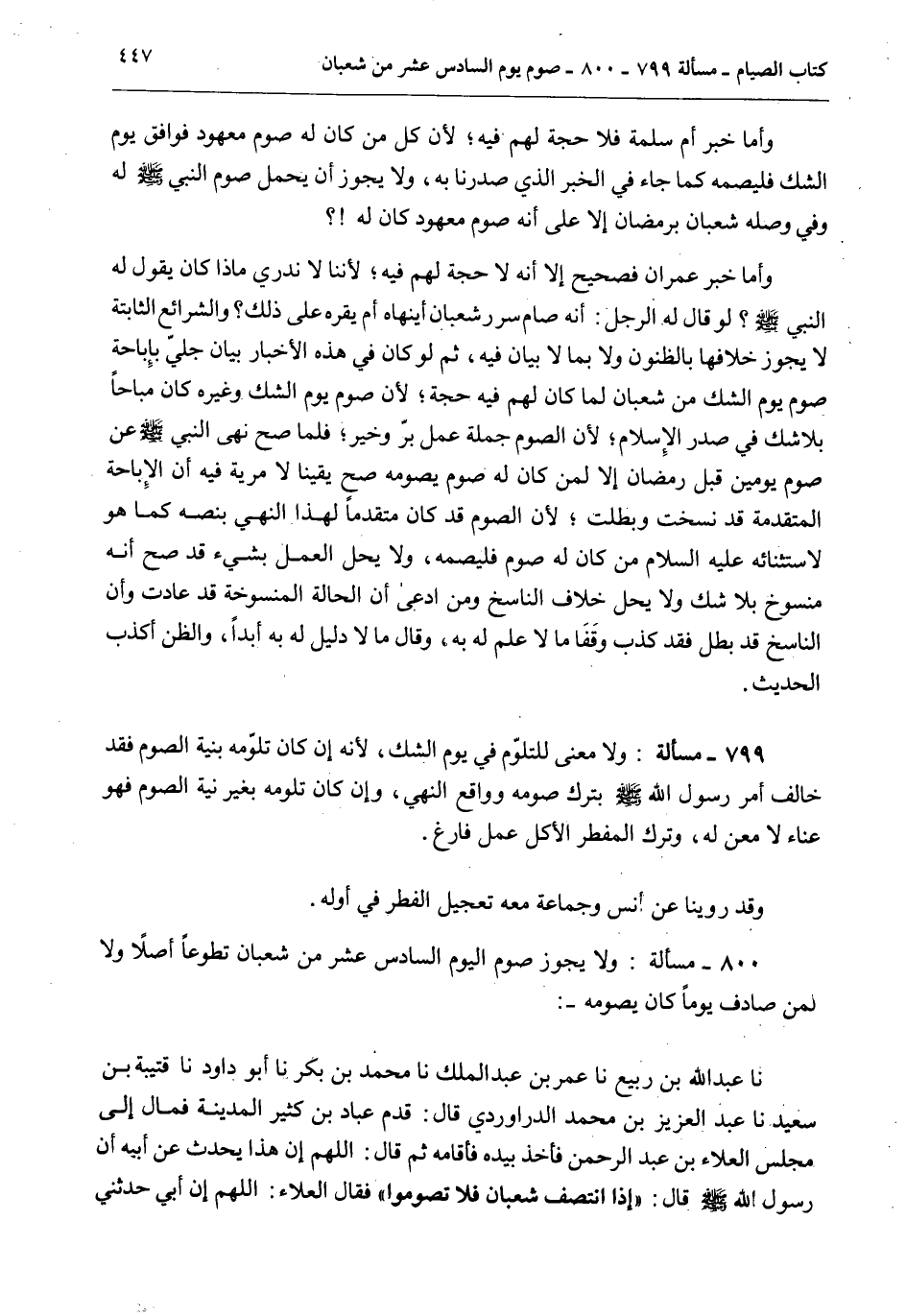 800 - مَسْأَلَةٌ: وَلَا يَجُوزُ صَوْمُ الْيَوْمِ السَّادِسَ عَشَرَ مِنْ شَعْبَانَ تَطَوُّعًا أَصْلًا وَلَا لِمَنْ صَادَفَ يَوْمًا كَانَ يَصُومُهُ -: نَا عَبْدُ اللَّهِ بْنُ رَبِيعٍ نَا عُمَرُ بْنُ عَبْدِ الْمَلِكِ نَا مُحَمَّدُ بْنُ بَكْرٍ نَا أَبُو دَاوُد نَا قُتَيْبَةُ بْنُ سَعِيدٍ نَا عَبْدُ الْعَزِيزِ بْنُ مُحَمَّدٍ الدَّرَاوَرْدِيُّ قَالَ: قَدِمَ عَبَّادُ بْنُ كَثِيرٍ الْمَدِينَةَ فَمَالَ إلَى مَجْلِسِ الْعَلَاءِ بْنِ عَبْدِ الرَّحْمَنِ فَأَخَذَ بِيَدِهِ فَأَقَامَهُ ثُمَّ قَالَ: اللَّهُمَّ إنَّ هَذَا يُحَدِّثُ عَنْ أَبِيهِ أَنَّ رَسُولَ اللَّهِ - صَلَّى اللَّهُ عَلَيْهِ وَسَلَّمَ - قَالَ: «إذَا انْتَصَفَ شَعْبَانُ فَلَا تَصُومُوا» فَقَالَ الْعَلَاءُ: اللَّهُمَّ إنَّ أَبِي حَدَّثَنِي