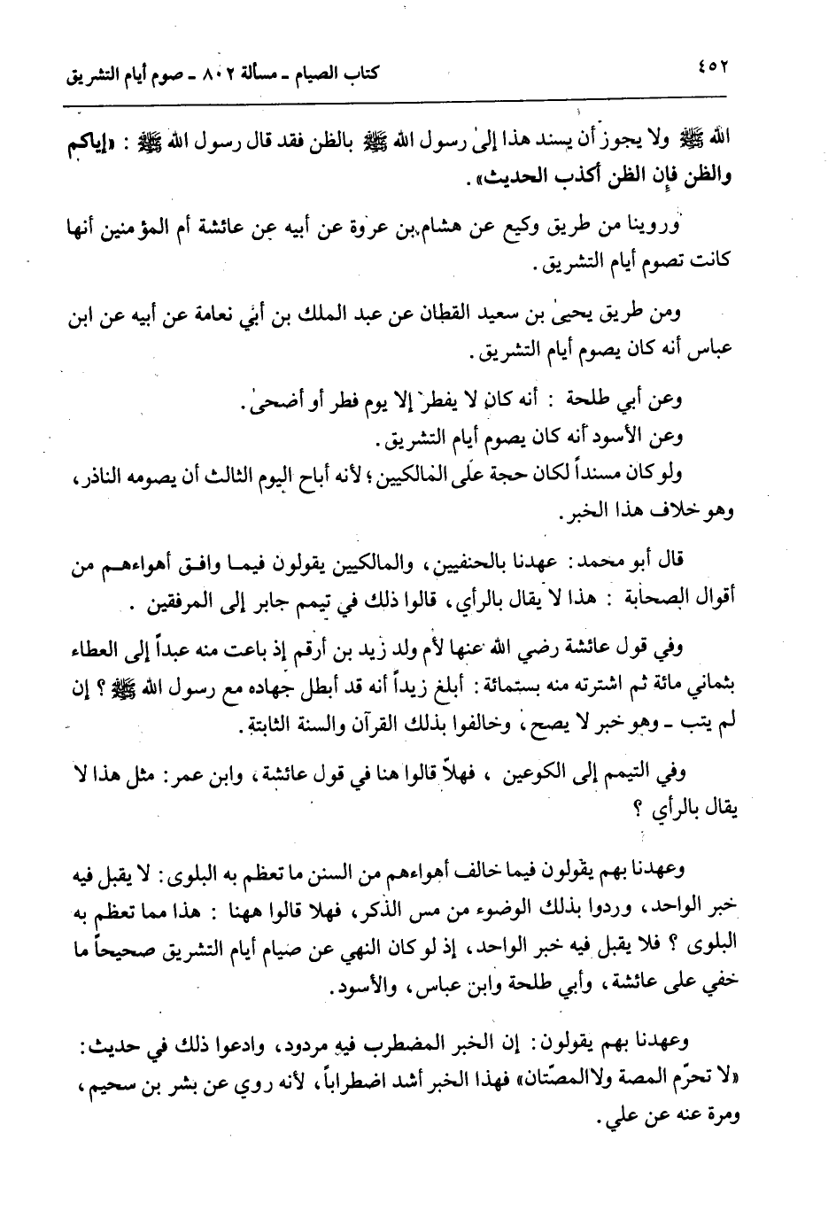 اللَّهِ - صَلَّى اللَّهُ عَلَيْهِ وَسَلَّمَ - وَلَا يَجُوزُ أَنْ يُسْنَدَ هَذَا إلَى رَسُولِ اللَّهِ - صَلَّى اللَّهُ عَلَيْهِ وَسَلَّمَ - بِالظَّنِّ فَقَدْ قَالَ رَسُولُ اللَّهِ - صَلَّى اللَّهُ عَلَيْهِ وَسَلَّمَ -: «إيَّاكُمْ وَالظَّنَّ فَإِنَّ الظَّنَّ أَكْذَبُ الْحَدِيثِ» . وَرُوِّينَا مِنْ طَرِيقِ وَكِيعٍ عَنْ هِشَامِ بْنِ عُرْوَةَ عَنْ أَبِيهِ عَنْ عَائِشَةَ أُمِّ الْمُؤْمِنِينَ أَنَّهَا كَانَتْ تَصُومُ أَيَّامَ التَّشْرِيقِ.
