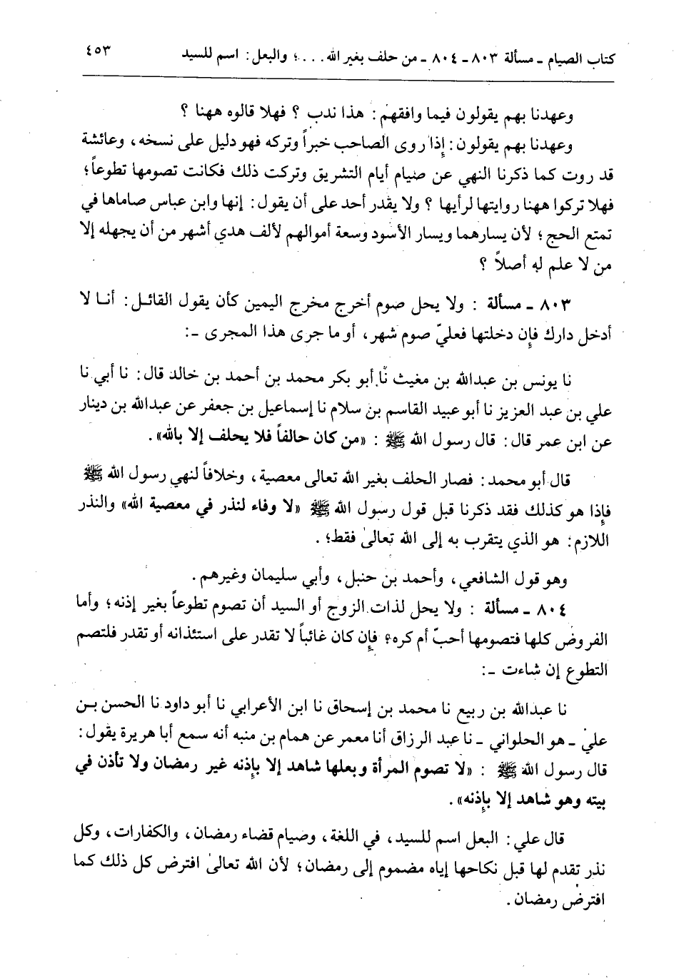 803 - مَسْأَلَةٌ: وَلَا يَحِلُّ صَوْمٌ أُخْرِجَ مَخْرَجَ الْيَمِينِ كَأَنْ يَقُولَ الْقَائِلُ: أَنَا لَا أَدْخُلُ دَارَكَ فَإِنْ دَخَلْتُهَا فَعَلَيَّ صَوْمُ شَهْرٍ، أَوْ مَا جَرَى هَذَا الْمَجْرَى -: نَا يُونُسُ بْنُ عَبْدِ اللَّهِ بْنِ مُغِيثٍ نَا أَبُو بَكْرٍ مُحَمَّدُ بْنُ أَحْمَدَ بْنِ خَالِدٍ قَالَ: نَا أَبِي نَا عَلِيُّ بْنُ عَبْدِ الْعَزِيزِ نَا أَبُو عُبَيْدِ الْقَاسِمِ بْنُ سَلَّامٍ نَا إسْمَاعِيلُ بْنُ جَعْفَرٍ عَنْ عَبْدِ اللَّهِ بْنِ دِينَارٍ عَنْ ابْنِ عُمَرَ قَالَ: قَالَ رَسُولُ اللَّهِ - صَلَّى اللَّهُ عَلَيْهِ وَسَلَّمَ -: «مَنْ كَانَ حَالِفًا فَلَا يَحْلِفْ إلَّا بِاَللَّهِ» .