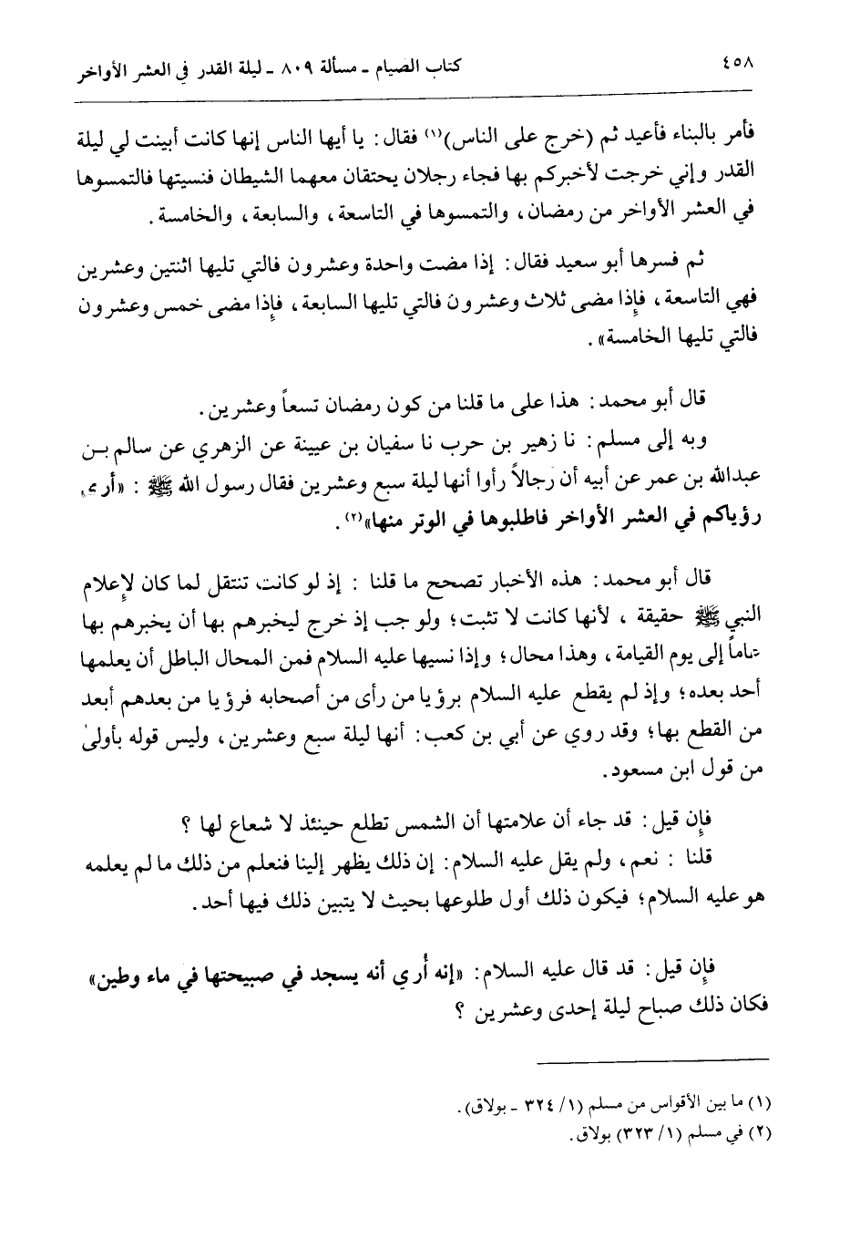قَالَ أَبُو مُحَمَّدٍ: هَذَا عَلَى مَا قُلْنَا مِنْ كَوْنِ رَمَضَانَ تِسْعًا وَعِشْرِينَ. وَبِهِ إلَى مُسْلِمٍ: نَا زُهَيْرُ بْنُ حَرْبٍ نَا سُفْيَانُ بْنُ عُيَيْنَةَ عَنْ الزُّهْرِيِّ عَنْ سَالِمِ بْنِ عَبْدِ اللَّهِ بْنِ عُمَرَ عَنْ أَبِيهِ «أَنَّ رِجَالًا رَأَوْا أَنَّهَا لَيْلَةُ سَبْعٍ وَعِشْرِينَ فَقَالَ رَسُولُ اللَّهِ - صَلَّى اللَّهُ عَلَيْهِ وَسَلَّمَ -: أَرَى رُؤْيَاكُمْ فِي الْعَشْرِ الْأَوَاخِرِ فَاطْلُبُوهَا فِي الْوِتْرِ مِنْهَا» . قَالَ أَبُو مُحَمَّدٍ: هَذِهِ الْأَخْبَارُ تُصَحِّحُ مَا قُلْنَا: إذْ لَوْ كَانَتْ تَنْتَقِلُ لَمَا كَانَ لِإِعْلَامِ النَّبِيِّ - صَلَّى اللَّهُ عَلَيْهِ وَسَلَّمَ - حَقِيقَةٌ، لِأَنَّهَا كَانَتْ لَا تَثْبُتُ؛ وَلَوَجَبَ إذْ خَرَجَ لِيُخْبِرَهُمْ بِهَا أَنْ يُخْبِرَهُمْ بِهَا عَامًّا إلَى يَوْمِ الْقِيَامَةِ، وَهَذَا مُحَالٌ؛ وَإِذَا نُسِّيهَا - عَلَيْهِ السَّلَامُ - فَمِنْ الْمُحَالِ الْبَاطِلِ أَنْ يَعْلَمَهَا أَحَدٌ بَعْدَهُ؛ وَإِذْ لَمْ يَقْطَعْ - عَلَيْهِ السَّلَامُ - بِرُؤْيَا مَنْ رَأَى مِنْ أَصْحَابِهِ فَرُؤْيَا مَنْ بَعْدَهُمْ أَبْعَدُ مِنْ الْقَطْعِ بِهَا؛ وَقَدْ رُوِيَ عَنْ أُبَيِّ بْنِ كَعْبٍ: أَنَّهَا لَيْلَةُ سَبْعٍ وَعِشْرِينَ، وَلَيْسَ قَوْلُهُ بِأَوْلَى مِنْ قَوْلِ ابْنِ مَسْعُودٍ. فَإِنْ قِيلَ: قَدْ جَاءَ أَنَّ عَلَامَتَهَا أَنَّ الشَّمْسَ تَطْلُعُ حِينَئِذٍ لَا شُعَاعَ لَهَا؟ قُلْنَا: نَعَمْ، وَلَمْ يَقُلْ - عَلَيْهِ السَّلَامُ -: إنَّ ذَلِكَ يَظْهَرُ إلَيْنَا فَنَعْلَمُ مِنْ ذَلِكَ مَا لَمْ يَعْلَمْهُ هُوَ - عَلَيْهِ السَّلَامُ -؛ فَيَكُونُ ذَلِكَ أَوَّلَ طُلُوعِهَا بِحَيْثُ لَا يَتَبَيَّنُ ذَلِكَ فِيهَا أَحَدٌ. فَإِنْ قِيلَ: قَدْ قَالَ - عَلَيْهِ السَّلَامُ -: «إنَّهُ أُرِيَ أَنَّهُ يَسْجُدُ فِي صَبِيحَتِهَا فِي مَاءٍ وَطِينٍ» فَكَانَ ذَلِكَ صَبَاحَ لَيْلَةِ إحْدَى وَعِشْرِينَ؟