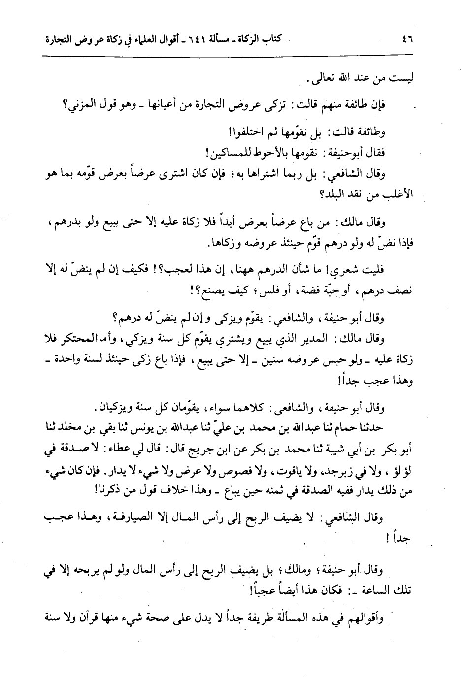 فَإِنَّ طَائِفَةً مِنْهُمْ قَالَتْ: تُزَكَّى عُرُوضُ التِّجَارَةِ مِنْ أَعْيَانِهَا. وَهُوَ قَوْلُ الْمُزَنِيِّ. وَطَائِفَةً قَالَتْ: بَلْ نُقَوِّمُهَا ثُمَّ اخْتَلَفُوا: فَقَالَ أَبُو حَنِيفَةَ: نُقَوِّمُهَا بِالْأَحْوَطِ لِلْمَسَاكِينِ. وَقَالَ الشَّافِعِيُّ: بَلْ رُبَّمَا اشْتَرَاهَا بِهِ؛ فَإِنْ كَانَ اشْتَرَى عَرَضًا بِعَرَضٍ قَوَّمَهُ بِمَا هُوَ الْأَغْلَبُ مِنْ نَقْدِ الْبَلَدِ. وَقَالَ مَالِكٌ: مَنْ بَاعَ عَرْضًا بِعَرْضٍ أَبَدًا فَلَا زَكَاةَ عَلَيْهِ إلَّا حَتَّى يَبِيعَ وَلَوْ بِدِرْهَمٍ، فَإِذَا نَضَّ لَهُ وَلَوْ دِرْهَمٌ قَوَّمَ حِينَئِذٍ عُرُوضَهُ وَزَكَّاهَا.