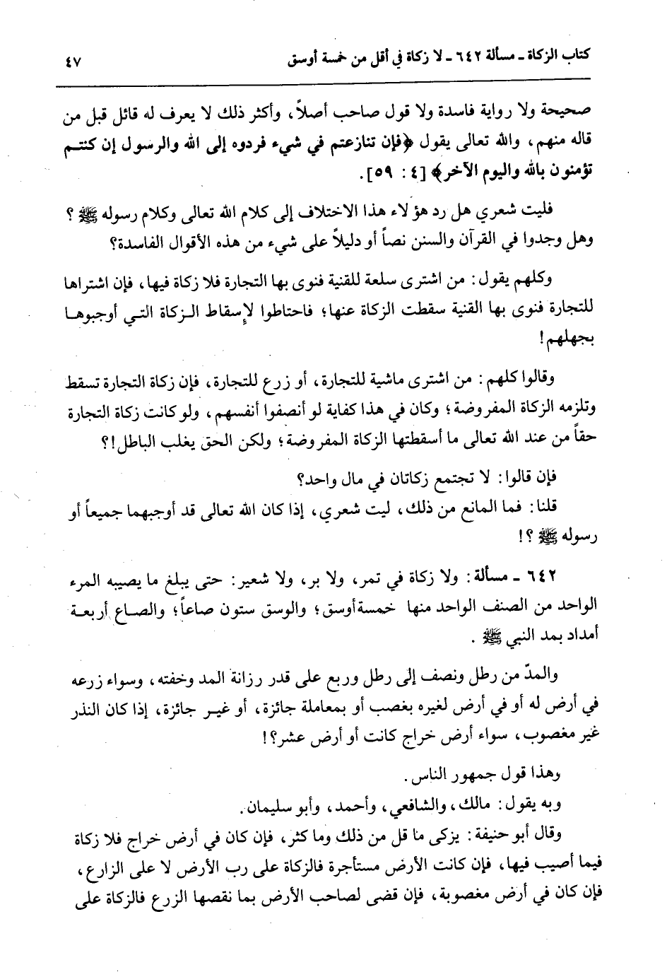 فَلَيْتَ شِعْرِي هَلْ رَدَّ هَؤُلَاءِ هَذَا الِاخْتِلَافَ إلَى كَلَامِ اللَّهِ تَعَالَى وَكَلَامِ رَسُولِهِ - صَلَّى اللَّهُ عَلَيْهِ وَسَلَّمَ -. وَهَلْ وَجَدُوا فِي الْقُرْآنِ وَالسُّنَنِ نَصًّا أَوْ دَلِيلًا عَلَى شَيْءٍ مِنْ هَذِهِ الْأَقْوَالِ الْفَاسِدَةِ. وَكُلُّهُمْ يَقُولُ: مَنْ اشْتَرَى سِلْعَةً لِلْقُنْيَةِ فَنَوَى بِهَا التِّجَارَةَ فَلَا زَكَاةَ فِيهَا، فَإِنْ اشْتَرَاهَا لِلتِّجَارَةِ فَنَوَى بِهَا الْقُنْيَةَ سَقَطَتْ الزَّكَاةُ عَنْهَا؛ فَاحْتَاطُوا لِإِسْقَاطِ الزَّكَاةِ الَّتِي أَوْجَبُوهَا بِجَهْلِهِمْ.