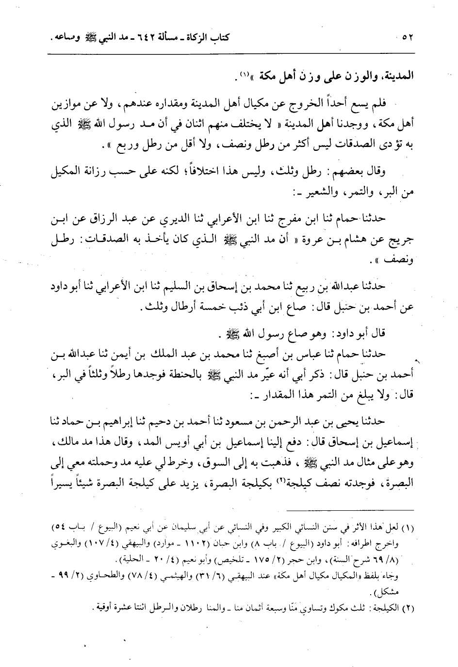 وَقَالَ بَعْضُهُمْ: رَطْلٌ وَثُلُثٌ، وَلَيْسَ هَذَا اخْتِلَافًا؛ لَكِنَّهُ عَلَى حَسَبِ رَزَانَةِ الْمَكِيلِ مِنْ الْبُرِّ، وَالتَّمْرِ، وَالشَّعِيرِ -: حَدَّثَنَا حُمَامٌ ثنا ابْنُ مُفَرِّجٍ ثنا ابْنُ الْأَعْرَابِيِّ ثنا الدَّبَرِيُّ عَنْ عَبْدِ الرَّزَّاقِ عَنْ ابْنِ جُرَيْجٍ عَنْ هِشَامِ بْنِ عُرْوَةَ «أَنَّ مُدَّ النَّبِيِّ - صَلَّى اللَّهُ عَلَيْهِ وَسَلَّمَ - الَّذِي كَانَ يَأْخُذُ بِهِ الصَّدَقَاتِ: رَطْلٌ وَنِصْفٌ» .