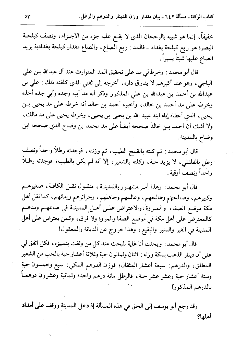 قَالَ أَبُو مُحَمَّدٍ: وَبَحَثْت أَنَا غَايَةَ الْبَحْثِ عِنْدَ كُلِّ مَنْ وَثِقْت بِتَمْيِيزِهِ، فَكُلٌّ اتَّفَقَ لِي عَلَى أَنَّ دِينَارَ الذَّهَبِ بِمَكَّةَ وَزْنُهُ: اثْنَانِ وَثَمَانُونَ حَبَّةً وَثَلَاثَةُ أَعْشَارِ حَبَّةٍ بِالْحَبِّ مِنْ الشَّعِيرِ الْمُطْلَقِ، وَالدِّرْهَمَ سَبْعَةُ أَعْشَارِ الْمِثْقَالِ؛ فَوَزْنُ الدِّرْهَمِ الْمَكِّيِّ سَبْعٌ وَخَمْسُونَ حَبَّةً وَسِتَّةُ أَعْشَارِ حَبَّةٍ وَعُشْرُ حَبَّةٍ، فَالرَّطْلُ مِائَةُ دِرْهَمٍ وَاحِدَةٍ وَثَمَانِيَةٌ وَعِشْرُونَ دِرْهَمًا بِالدِّرْهَمِ الْمَذْكُورِ.