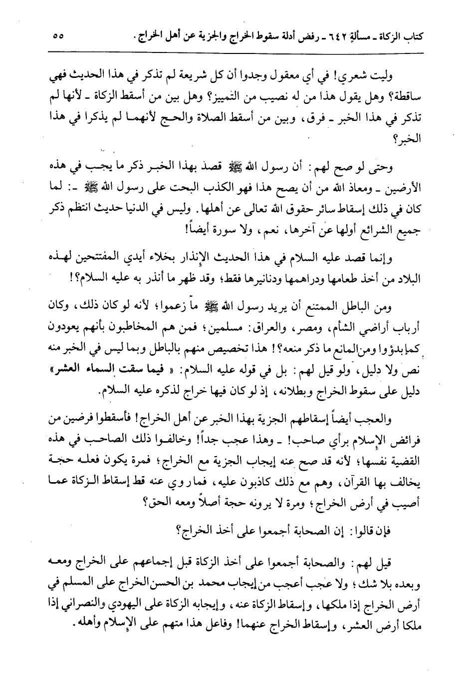 وَخَالَفُوا ذَلِكَ الصَّاحِبَ فِي هَذِهِ الْقَضِيَّةِ نَفْسِهَا؛ لِأَنَّهُ قَدْ صَحَّ عَنْهُ إيجَابُ الْجِزْيَةِ مَعَ الْخَرَاجِ؛ فَمَرَّةً يَكُونُ فِعْلُهُ حُجَّةً يُخَالِفُ بِهَا الْقُرْآنَ، وَهُمْ مَعَ ذَلِكَ كَاذِبُونَ عَلَيْهِ، فَمَا رُوِيَ عَنْهُ قَطُّ إسْقَاطُ الزَّكَاةِ عَمَّا أُصِيبَ فِي أَرْضِ الْخَرَاجِ؛ وَمَرَّةً لَا يَرَوْنَهُ حُجَّةً أَصْلًا وَمَعَهُ الْحَقُّ. فَإِنْ قَالُوا: إنَّ الصَّحَابَةَ أَجْمَعُوا عَلَى أَخْذِ الْخَرَاجِ قِيلَ لَهُمْ: وَالصَّحَابَةُ أَجْمَعُوا عَلَى أَخْذِ الزَّكَاةِ قَبْلَ إجْمَاعِهِمْ عَلَى الْخَرَاجِ وَمَعَهُ وَبَعْدَهُ بِلَا شَكٍّ؛ وَلَا عَجَبَ أَعْجَبُ مِنْ إيجَابِ مُحَمَّدِ بْنِ الْحَسَنِ الْخَرَاجَ عَلَى الْمُسْلِمِ فِي أَرْضِ الْخَرَاجِ إذَا مَلَكَهَا، وَإِسْقَاطُ الزَّكَاةِ عَنْهُ، وَإِيجَابُهُ الزَّكَاةَ عَلَى الْيَهُودِيِّ وَالنَّصْرَانِيِّ إذَا مَلَكَا أَرْضَ الْعُشْرِ، وَإِسْقَاطُ الْخَرَاجِ عَنْهُمَا وَفَاعِلُ هَذَا مُتَّهَمٌ عَلَى الْإِسْلَامِ وَأَهْلِهِ.