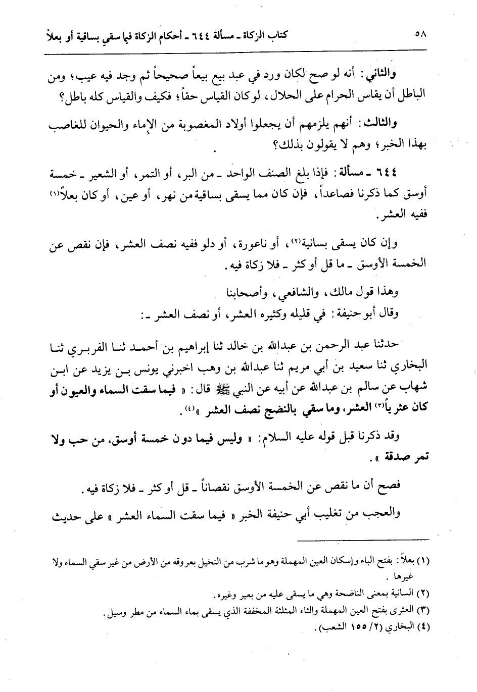 644 - مَسْأَلَةٌ: فَإِذَا بَلَغَ الصِّنْفُ الْوَاحِدُ - مِنْ الْبُرِّ، أَوْ التَّمْرِ، أَوْ الشَّعِيرِ - خَمْسَةَ أَوْسُقٍ كَمَا ذَكَرْنَا فَصَاعِدًا، فَإِنْ كَانَ مِمَّا يُسْقَى بِسَاقِيَةٍ مِنْ نَهْرٍ، أَوْ عَيْنٍ، أَوْ كَانَ بَعْلًا فَفِيهِ الْعُشْرُ.