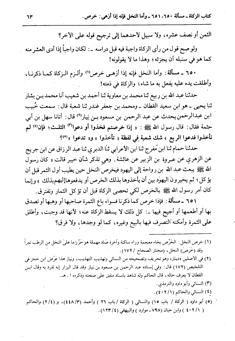 650 - مَسْأَلَةٌ: وَأَمَّا النَّخْلُ فَإِنَّهُ إذَا أَزْهَى خُرِصَ وَأُلْزِمَ الزَّكَاةَ كَمَا ذَكَرْنَا، وَأُطْلِقَتْ يَدُهُ عَلَيْهِ يَفْعَلُ بِهِ مَا شَاءَ؛ وَالزَّكَاةُ فِي ذِمَّتِهِ حَدَّثَنَا عَبْدُ اللَّهِ بْنُ رَبِيعٍ ثنا مُحَمَّدُ بْنُ مُعَاوِيَةَ ثنا أَحْمَدُ بْنُ شُعَيْبٍ أَنَا مُحَمَّدُ بْنُ بَشَّارٍ ثنا يَحْيَى هُوَ ابْنُ سَعِيدِ الْقَطَّانِ - وَمُحَمَّدُ بْنُ جَعْفَرٍ غُنْدَرٌ ثنا شُعْبَةُ قَالَ: سَمِعْت خُبَيْبَ بْنَ عَبْدِ الرَّحْمَنِ يُحَدِّثُ عَنْ عَبْدِ الرَّحْمَنِ بْنِ مَسْعُودِ بْنِ نِيَارٍ قَالَ: أَتَانَا سَهْلُ بْنُ أَبِي حَثْمَةَ فَقَالَ: قَالَ رَسُولُ اللَّهِ - صَلَّى اللَّهُ عَلَيْهِ وَسَلَّمَ -: «إذَا خَرَصْتُمْ فَخُذُوا أَوْ دَعُوا الثُّلُثَ؛ فَإِنْ لَمْ تَأْخُذُوا فَدَعُوا الرُّبُعَ» شَكَّ شُعْبَةُ فِي لَفْظَةِ تَأْخُذُوا وَ " تَدَعُوا "؟ حَدَّثَنَا حُمَامٌ ثنا ابْنُ مُفَرِّجٍ ثنا ابْنُ الْأَعْرَابِيِّ ثنا الدَّبَرِيُّ ثنا عَبْدُ الرَّزَّاقِ عَنْ ابْنِ جُرَيْجٍ عَنْ الزُّهْرِيِّ عَنْ عُرْوَةَ بْنِ الزُّبَيْرِ عَنْ عَائِشَةَ.