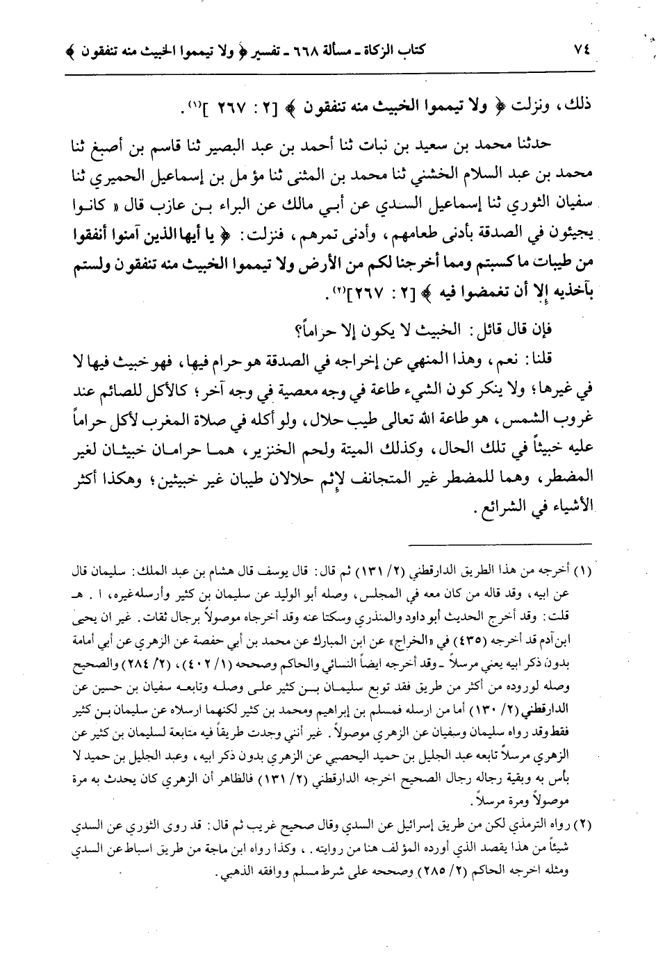 حَدَّثَنَا مُحَمَّدُ بْنُ سَعِيدِ بْنِ نَبَاتٍ ثنا أَحْمَدُ بْنُ عَبْدِ الْبَصِيرِ ثنا قَاسِمُ بْنُ أَصْبَغَ ثنا مُحَمَّدُ بْنُ عَبْدِ السَّلَامِ الْخُشَنِيِّ ثنا مُحَمَّدُ بْنُ الْمُثَنَّى ثنا مُؤَمَّلُ بْنُ إسْمَاعِيلَ الْحِمْيَرِيِّ ثنا سُفْيَانُ الثَّوْرِيُّ ثنا إسْمَاعِيلُ السُّدِّيَّ عَنْ أَبِي مَالِكٍ عَنْ الْبَرَاءِ بْنِ عَازِبٍ قَالَ كَانُوا يَجِيئُونَ فِي الصَّدَقَةِ بِأَدْنَى طَعَامِهِمْ، وَأَدْنَى تَمْرِهِمْ، فَنَزَلَتْ: {يَا أَيُّهَا الَّذِينَ آمَنُوا أَنْفِقُوا مِنْ طَيِّبَاتِ مَا كَسَبْتُمْ وَمِمَّا أَخْرَجْنَا لَكُمْ مِنَ الأَرْضِ وَلا تَيَمَّمُوا الْخَبِيثَ مِنْهُ تُنْفِقُونَ وَلَسْتُمْ بِآخِذِيهِ إِلا أَنْ تُغْمِضُوا فِيهِ} [البقرة: 267] .
