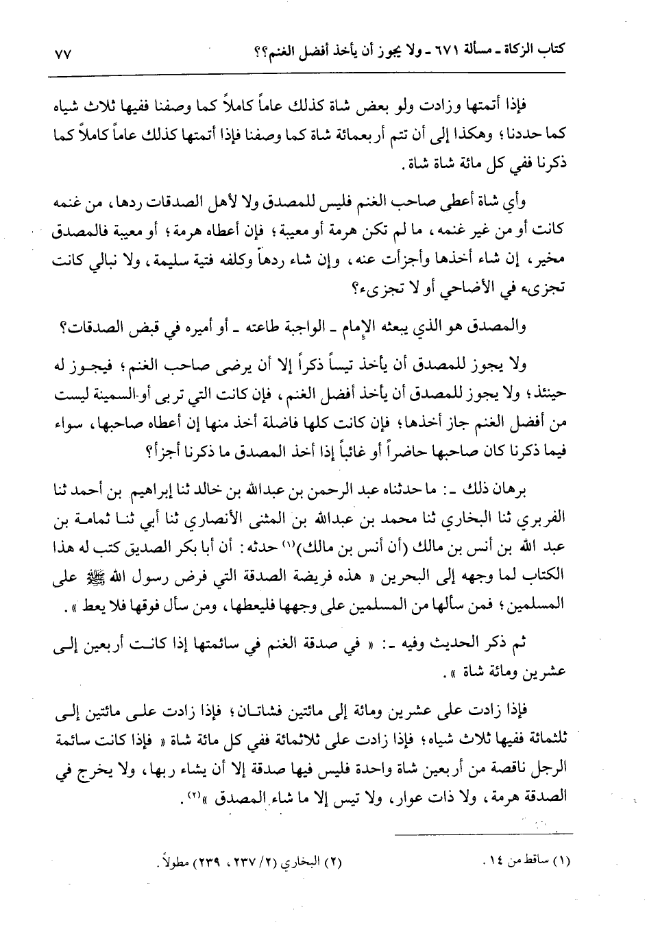 وَأَيَّ شَاةٍ أَعْطَى صَاحِبُ الْغَنَمِ فَلَيْسَ لِلْمُصَدِّقِ وَلَا لِأَهْلِ الصَّدَقَاتِ رَدُّهَا، مِنْ غَنَمِهِ كَانَتْ أَوْ مِنْ غَيْرِ غَنَمِهِ، مَا لَمْ تَكُنْ هَرِمَةً أَوْ مَعِيبَةً؛ فَإِنْ أَعْطَاهُ هَرِمَةً؛ أَوْ مَعِيبَةً فَالْمُصَدِّقُ مُخَيَّرٌ، إنْ شَاءَ أَخَذَهَا وَأَجْزَأَتْ عَنْهُ، وَإِنْ شَاءَ رَدَّهَا وَكَلَّفَهُ فَتِيَّةً سَلِيمَةً، وَلَا نُبَالِي كَانَتْ تُجْزِئُ فِي الْأَضَاحِيِّ أَوْ لَا تُجْزِئُ؟ وَالْمُصَدِّقُ هُوَ الَّذِي يَبْعَثُهُ الْإِمَامُ - الْوَاجِبَةُ طَاعَتُهُ - أَوْ أَمِيرُهُ فِي قَبْضِ الصَّدَقَاتِ؟ وَلَا يَجُوزُ لِلْمُصَدِّقِ أَنْ يَأْخُذَ تَيْسًا ذَكَرًا إلَّا أَنْ يَرْضَى صَاحِبُ الْغَنَمِ؛ فَيَجُوزُ لَهُ حِينَئِذٍ؛ وَلَا يَجُوزُ لِلْمُصَدِّقِ أَنْ يَأْخُذَ أَفْضَلَ الْغَنَمِ، فَإِنْ كَانَتْ الَّتِي تَرْبَى أَوْ السَّمِينَةُ لَيْسَتْ مِنْ أَفْضَلِ الْغَنَمِ جَازَ أَخْذُهَا؛ فَإِنْ كَانَتْ كُلُّهَا فَاضِلَةً أَخَذَ مِنْهَا إنْ أَعْطَاهُ صَاحِبُهَا، سَوَاءٌ فِيمَا ذَكَرْنَا كَانَ صَاحِبُهَا حَاضِرًا أَوْ غَائِبًا إذَا أَخَذَ الْمُصَدِّقُ مَا ذَكَرْنَا أَجَزَّأَ؟ بُرْهَانُ ذَلِكَ -: مَا حَدَّثَنَاهُ عَبْدُ الرَّحْمَنِ بْنِ عَبْدِ اللَّهِ بْنِ خَالِدٍ ثنا إبْرَاهِيمُ بْنُ أَحْمَدَ ثنا الْفَرَبْرِيُّ ثنا الْبُخَارِيُّ ثنا مُحَمَّدُ بْنُ عَبْدِ اللَّهِ بْنِ الْمُثَنَّى الْأَنْصَارِيُّ ثنا أَبِي ثنا ثُمَامَةُ بْنُ عَبْدِ اللَّهِ بْنِ أَنَسِ بْنِ مَالِكٍ (أَنَّ أَنَسَ بْنَ مَالِكٍ) حَدَّثَهُ: أَنَّ أَبَا بَكْرٍ الصِّدِّيقَ كَتَبَ لَهُ هَذَا الْكِتَابَ لَمَّا وَجَّهَهُ إلَى الْبَحْرَيْنِ " هَذِهِ فَرِيضَةُ الصَّدَقَةِ الَّتِي فَرَضَ رَسُولُ اللَّهِ - صَلَّى اللَّهُ عَلَيْهِ وَسَلَّمَ - عَلَى الْمُسْلِمِينَ؛ فَمَنْ سَأَلَهَا مِنْ الْمُسْلِمِينَ عَلَى وَجْهِهَا فَلْيُعْطِهَا، وَمَنْ سَأَلَ فَوْقَهَا فَلَا يُعْطَ ". ثُمَّ ذَكَرَ الْحَدِيثَ وَفِيهِ -: «فِي صَدَقَةِ الْغَنَمِ فِي سَائِمَتِهَا إذَا كَانَتْ أَرْبَعِينَ إلَى عِشْرِينَ وَمِائَةٍ شَاةٌ» فَإِذَا زَادَتْ عَلَى عِشْرِينَ وَمِائَةٍ إلَى مِائَتَيْنِ فَشَاتَانِ؛ فَإِذَا زَادَتْ عَلَى مِائَتَيْنِ إلَى ثَلَثِمِائَةٍ فَفِيهَا ثَلَاثُ شِيَاهٍ؛ فَإِذَا زَادَتْ عَلَى ثَلَاثِمِائَةٍ فَفِي كُلِّ مِائَةٍ شَاةٌ فَإِذَا كَانَتْ سَائِمَةُ الرَّجُلِ نَاقِصَةً مِنْ أَرْبَعِينَ شَاةٌ وَاحِدَةٌ فَلَيْسَ فِيهَا صَدَقَةٌ إلَّا أَنْ يَشَاءَ رَبُّهَا، وَلَا يُخْرِجُ فِي الصَّدَقَةِ هَرِمَةً، وَلَا ذَاتُ عَوَارٍ، وَلَا تَيْسٌ إلَّا مَا شَاءَ الْمُصَدِّقُ.