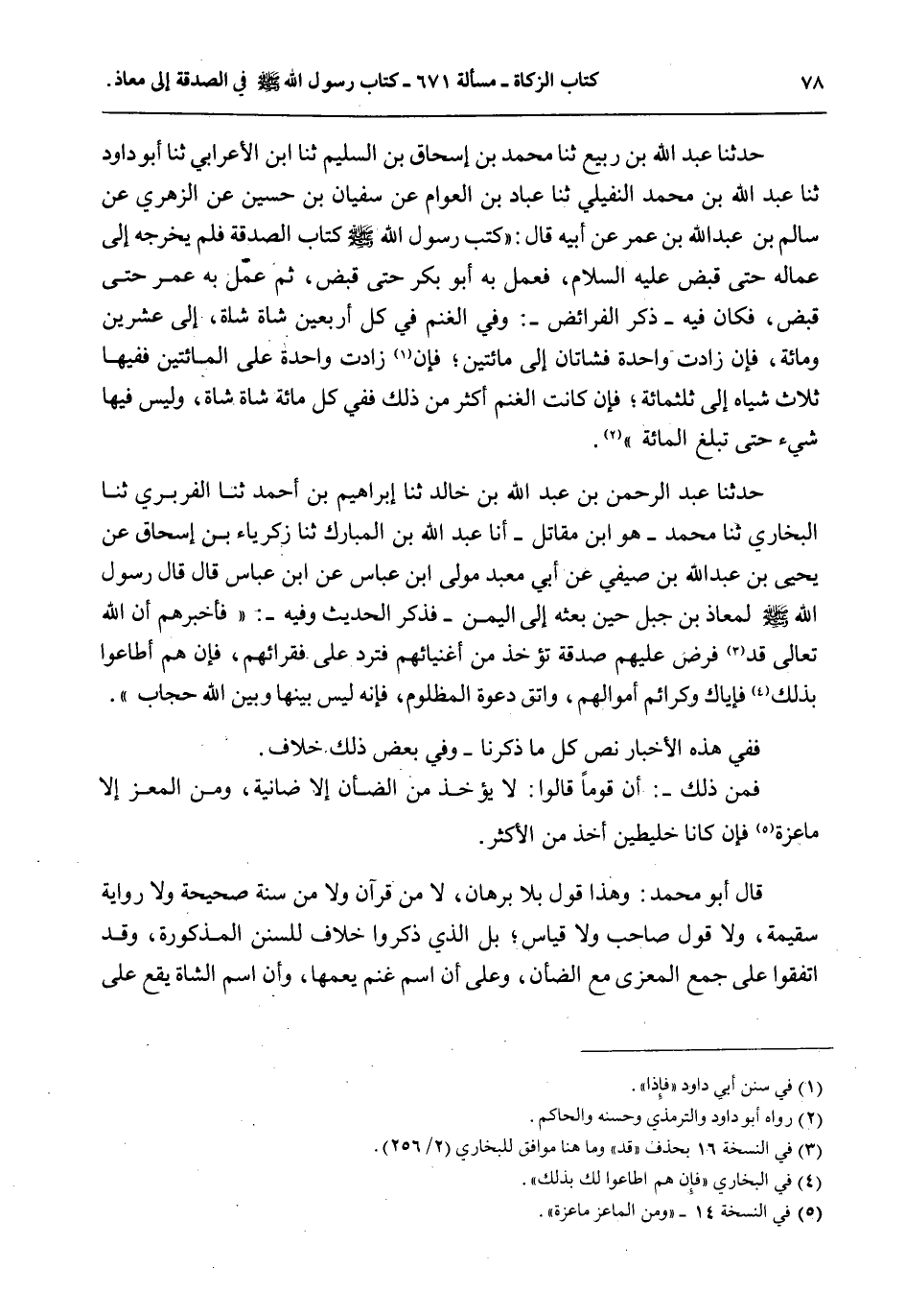 حَدَّثَنَا عَبْدُ اللَّهِ بْنُ رَبِيعٍ ثنا مُحَمَّدُ بْنُ إِسْحَاقَ بْنِ السَّلِيمِ ثنا ابْنُ الْأَعْرَابِيِّ ثنا أَبُو دَاوُد ثنا عَبْدُ اللَّهِ بْنُ مُحَمَّدِ النُّفَيْلِيِّ ثنا عَبَّادُ بْنُ الْعَوَّامِ عَنْ سُفْيَانَ بْنِ حُسَيْنٍ عَنْ الزُّهْرِيِّ عَنْ سَالِمِ بْنِ عَبْدِ اللَّهِ بْنِ عُمَرَ عَنْ أَبِيهِ قَالَ: «كَتَبَ رَسُولُ اللَّهِ - صَلَّى اللَّهُ عَلَيْهِ وَسَلَّمَ - كِتَابَ الصَّدَقَةِ فَلَمْ يُخْرِجْهُ إلَى عُمَّالِهِ حَتَّى قُبِضَ - عَلَيْهِ السَّلَامُ -، فَعَمِلَ بِهِ أَبُو بَكْرٍ حَتَّى قُبِضَ، ثُمَّ عَمِلَ بِهِ عُمَرُ حَتَّى قُبِضَ، فَكَانَ فِيهِ - ذِكْرُ الْفَرَائِضِ -: وَفِي الْغَنَمِ فِي كُلِّ أَرْبَعِينَ شَاةً شَاةٌ، إلَى عِشْرِينَ وَمِائَةٍ، فَإِنْ زَادَتْ وَاحِدَةٌ فَشَاتَانِ إلَى مِائَتَيْنِ، فَإِنْ زَادَتْ وَاحِدَةٌ عَلَى الْمِائَتَيْنِ فَفِيهَا ثَلَاثُ شِيَاهٍ إلَى ثَلَثِمِائَةٍ، فَإِنْ كَانَتْ الْغَنَمُ أَكْثَرَ مِنْ ذَلِكَ فَفِي كُلِّ مِائَةِ شَاةٍ شَاةٌ، وَلَيْسَ فِيهَا شَيْءٌ حَتَّى تَبْلُغَ الْمِائَةَ» .