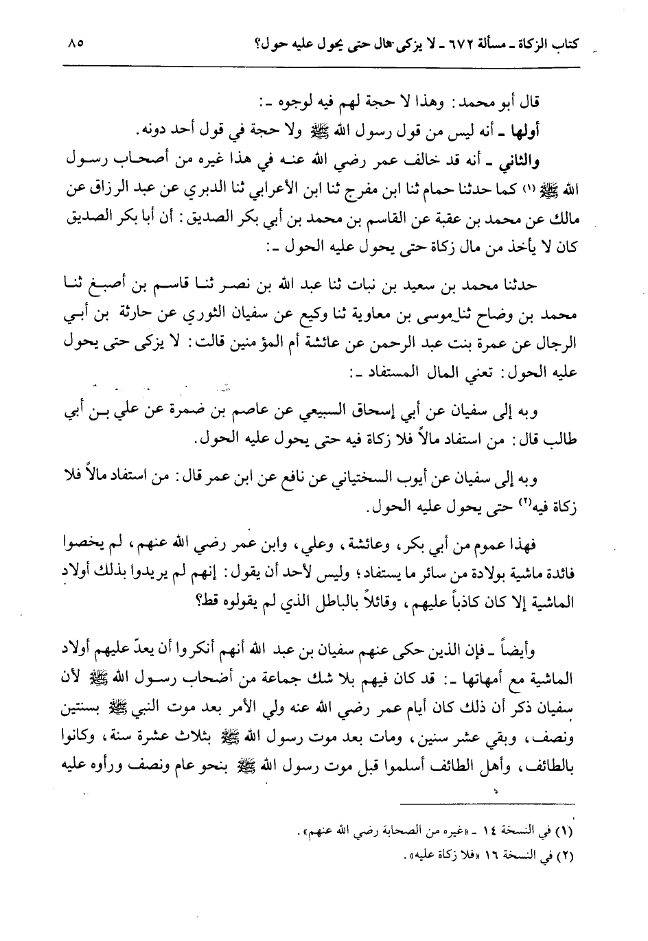 فَهَذَا عُمُومٌ مِنْ أَبِي بَكْرٍ، وَعَائِشَةَ، وَعَلِيٍّ، وَابْنِ عُمَرَ - رَضِيَ اللَّهُ عَنْهُمْ -، لَمْ يَخُصُّوا فَائِدَةَ مَاشِيَةٍ بِوِلَادَةٍ مِنْ سَائِرِ مَا يُسْتَفَادُ؛ وَلَيْسَ لِأَحَدٍ أَنْ يَقُولَ إنَّهُمْ لَمْ يُرِيدُوا بِذَلِكَ أَوْلَادَ الْمَاشِيَةِ إلَّا كَانَ كَاذِبًا عَلَيْهِمْ، وَقَائِلًا بِالْبَاطِلِ الَّذِي لَمْ يَقُولُوهُ قَطُّ؟ وَأَيْضًا - فَإِنَّ الَّذِينَ حَكَى عَنْهُمْ سُفْيَانُ بْنُ عَبْدِ اللَّهِ أَنَّهُمْ أَنْكَرُوا أَنْ يَعُدَّ عَلَيْهِمْ أَوْلَادَ الْمَاشِيَةِ مَعَ أُمَّهَاتِهَا -: قَدْ كَانَ فِيهِمْ بِلَا شَكٍّ جَمَاعَةٌ مِنْ أَصْحَابِ رَسُولِ اللَّهِ - صَلَّى اللَّهُ عَلَيْهِ وَسَلَّمَ - لِأَنَّ سُفْيَانَ ذَكَرَ أَنَّ ذَلِكَ كَانَ أَيَّامَ عُمَرَ - رَضِيَ اللَّهُ عَنْهُ - وَلِيَ الْأَمْرَ بَعْدَ مَوْتِ النَّبِيِّ - صَلَّى اللَّهُ عَلَيْهِ وَسَلَّمَ - بِسَنَتَيْنِ وَنِصْفٍ، وَبَقِيَ عَشْرَ سِنِينَ، وَمَاتَ بَعْدَ مَوْتِ رَسُولِ اللَّهِ - صَلَّى اللَّهُ عَلَيْهِ وَسَلَّمَ - بِثَلَاثَ عَشْرَةَ سَنَةً، وَكَانُوا بِالطَّائِفِ، وَأَهْلُ الطَّائِفِ أَسْلَمُوا قَبْلَ مَوْتِ رَسُولِ اللَّهِ - صَلَّى اللَّهُ عَلَيْهِ وَسَلَّمَ - بِنَحْوِ عَامٍ وَنِصْفٍ وَرَأَوْهُ عَلَيْهِ