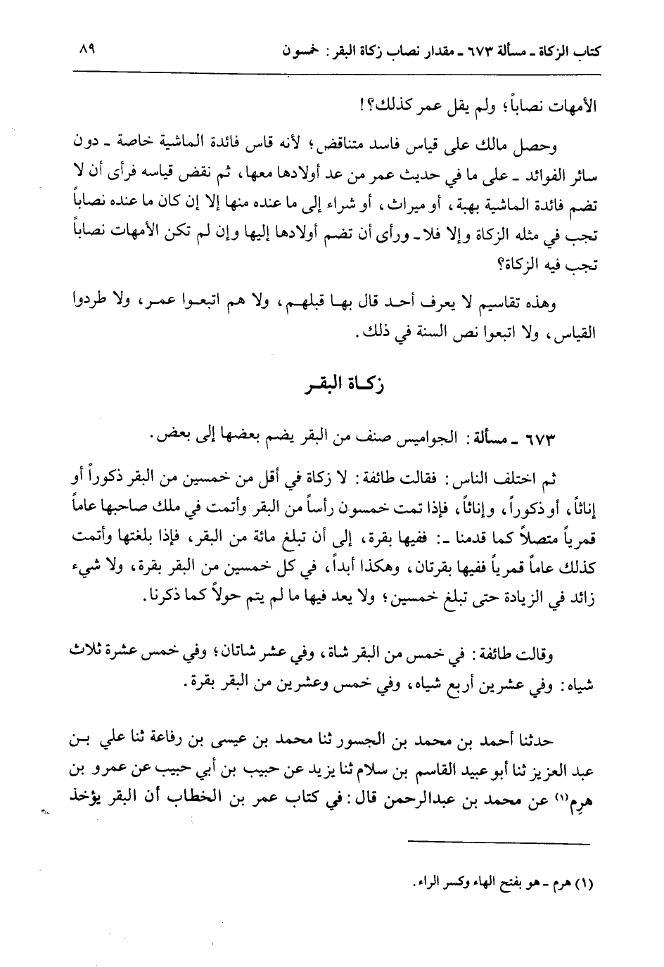 حَدَّثَنَا أَحْمَدُ بْنُ مُحَمَّدِ بْنِ الْجَسُورِ ثنا مُحَمَّدُ بْنُ عِيسَى بْنِ رِفَاعَةَ ثنا عَلِيُّ بْنُ عَبْدِ الْعَزِيزِ ثنا أَبُو عُبَيْدٍ الْقَاسِمُ بْنُ سَلَامٍ ثنا يَزِيدُ عَنْ حَبِيبِ بْنِ أَبِي حَبِيبٍ عَنْ عَمْرِو بْنِ هَرِمٍ عَنْ مُحَمَّدِ بْنِ عَبْدِ الرَّحْمَنِ قَالَ: فِي كِتَابِ عُمَرَ بْنِ الْخَطَّابِ أَنَّ الْبَقَرَ يُؤْخَذُ
