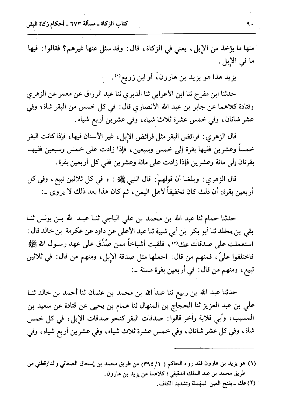 قَالَ الزُّهْرِيُّ: وَبَلَغَنَا أَنَّ قَوْلَهُمْ: قَالَ النَّبِيُّ - صَلَّى اللَّهُ عَلَيْهِ وَسَلَّمَ -: «فِي كُلِّ ثَلَاثِينَ تَبِيعٌ، وَفِي كُلِّ أَرْبَعِينَ بَقَرَةٌ» أَنَّ ذَلِكَ كَانَ تَخْفِيفًا لِأَهْلِ الْيَمَنِ، ثُمَّ كَانَ هَذَا بَعْدَ ذَلِكَ لَا يُرْوَى -: حَدَّثَنَا حُمَامٌ ثنا عَبْدُ اللَّهِ بْنُ مُحَمَّدِ بْنِ عَلِيٍّ الْبَاجِيَّ ثنا عَبْدُ اللَّهِ بْنُ يُونُسَ ثنا بَقِيُّ بْنُ مَخْلَدٍ ثنا أَبُو بَكْرِ بْنُ أَبِي شَيْبَةَ ثنا عَبْدُ الْأَعْلَى عَنْ دَاوُد عَنْ عِكْرِمَةَ بْنِ خَالِدٍ قَالَ: اُسْتُعْمِلْت عَلَى صَدَقَاتِ عَكَّ، فَلَقِيت أَشْيَاخًا مِمَّنْ صَدَقَ عَلَى عَهْدِ رَسُولِ اللَّه - صَلَّى اللَّهُ عَلَيْهِ وَسَلَّمَ - فَاخْتَلَفُوا عَلَيَّ، فَمِنْهُمْ مَنْ قَالَ: اجْعَلْهَا مِثْلَ صَدَقَةِ الْإِبِلِ، وَمِنْهُمْ مَنْ قَالَ: فِي ثَلَاثِينَ تَبِيعٌ، وَمِنْهُمْ مَنْ قَالَ: فِي أَرْبَعِينَ بَقَرَةٌ مُسِنَّةٌ -: حَدَّثَنَا عَبْدُ اللَّهِ بْنُ رَبِيعٍ ثنا عَبْدُ اللَّهِ بْنُ مُحَمَّدِ بْنِ عُثْمَانَ ثنا أَحْمَدُ بْنُ خَالِدٍ ثنا عَلِيُّ بْنُ عَبْدِ الْعَزِيزِ ثنا الْحَجَّاجُ بْنُ الْمِنْهَالِ ثنا هَمَّامُ بْنُ يَحْيَى عَنْ قَتَادَةَ عَنْ سَعِيدِ بْنِ الْمُسَيِّبِ، وَأَبِي قِلَابَةَ وَآخَرُ قَالُوا: صَدَقَاتُ الْبَقَرِ كَنَحْوِ صَدَقَاتِ الْإِبِلِ، فِي كُلِّ خَمْسٍ شَاةٌ، وَفِي كُلِّ عَشْرٍ شَاتَانِ، وَفِي خَمْسَ عَشَرَةَ ثَلَاثُ شِيَاهٍ، وَفِي عِشْرِينَ أَرْبَعُ شِيَاهٍ، وَفِي
