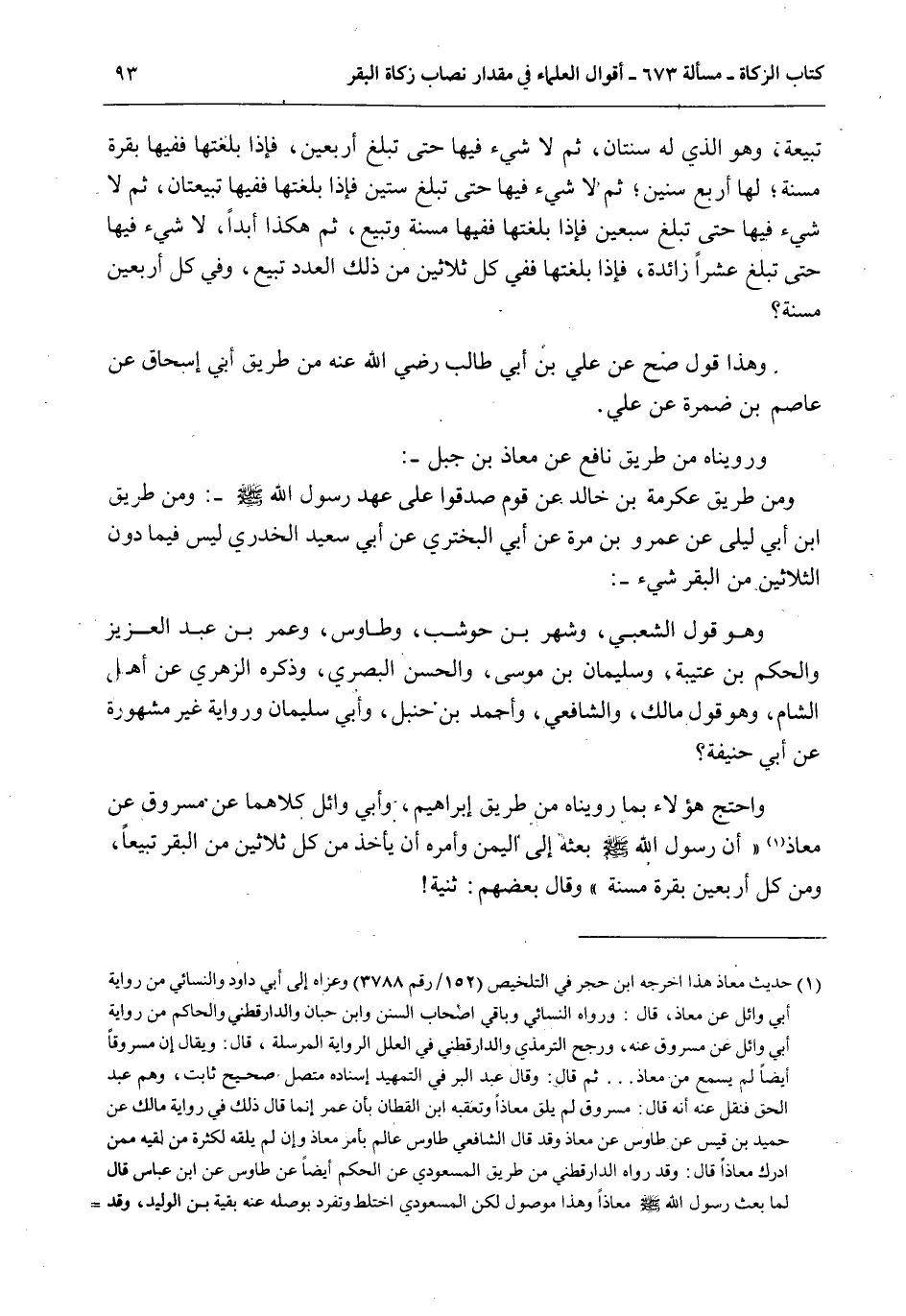 وَرُوِّينَاهُ مِنْ طَرِيقِ نَافِعٍ عَنْ مُعَاذِ بْنِ جَبَلٍ -: وَمِنْ طَرِيقِ عِكْرِمَةَ بْنِ خَالِدٍ عَنْ قَوْمٍ صَدَّقُوا عَلَى عَهْدِ رَسُولِ اللَّهِ - صَلَّى اللَّهُ عَلَيْهِ وَسَلَّمَ -: وَمِنْ طَرِيقِ ابْنِ أَبِي لَيْلَى عَنْ عَمْرِو بْنِ مُرَّةَ عَنْ أَبِي الْبَخْتَرِيِّ عَنْ أَبِي سَعِيدٍ الْخُدْرِيِّ لَيْسَ فِيمَا دُونَ الثَّلَاثِينَ مِنْ الْبَقَرِ شَيْءٌ -: وَهُوَ قَوْلُ الشَّعْبِيِّ، وَشَهْرِ بْنِ حَوْشَبٍ، وَطَاوُسٍ، وَعُمَرَ بْنِ عَبْدِ الْعَزِيزِ وَالْحَكَمِ بْنِ عُتَيْبَةَ، وَسُلَيْمَانَ بْنِ مُوسَى، وَالْحَسَنِ الْبَصْرِيِّ، وَذَكَرَهُ الزُّهْرِيُّ عَنْ أَهْلِ الشَّامِ، وَهُوَ قَوْلُ مَالِكٍ، وَالشَّافِعِيِّ، وَأَحْمَدَ بْنِ حَنْبَلٍ، وَأَبِي سُلَيْمَانَ وَرِوَايَةٌ غَيْرُ مَشْهُورَةٍ عَنْ أَبِي حَنِيفَةَ؟ وَاحْتَجَّ هَؤُلَاءِ بِمَا رُوِّينَاهُ مِنْ طَرِيقِ إبْرَاهِيمَ، وَأَبِي وَائِلٍ كِلَاهُمَا عَنْ مَسْرُوقٍ عَنْ مُعَاذٍ «أَنَّ رَسُولَ اللَّهِ - صَلَّى اللَّهُ عَلَيْهِ وَسَلَّمَ - بَعَثَهُ إلَى الْيَمَنِ وَأَمَرَهُ أَنْ يَأْخُذَ مِنْ كُلِّ ثَلَاثِينَ مِنْ الْبَقَرِ تَبِيعًا، وَمِنْ كُلِّ أَرْبَعِينَ بَقَرَةً مُسِنَّةً» وَقَالَ بَعْضُهُمْ: ثَنِيَّةٌ