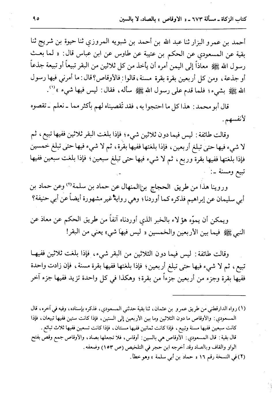 أَحْمَدُ بْنُ عَمْرٍو الْبَزَّارُ ثنا عَبْدُ اللَّهِ بْنِ أَحْمَدَ بْنِ شَبَّوَيْهِ الْمَرْوَزِيِّ ثنا حَيْوَةُ بْنُ شُرَيْحٍ ثنا بَقِيَّةُ عَنْ الْمَسْعُودِيِّ عَنْ الْحَكَمِ بْنِ عُتَيْبَةَ عَنْ طَاوُسٍ عَنْ ابْنِ عَبَّاسٍ قَالَ: «لَمَّا بَعَثَ رَسُولُ اللَّه - صَلَّى اللَّهُ عَلَيْهِ وَسَلَّمَ - مُعَاذًا إلَى الْيَمَنِ أَمَرَهُ أَنْ يَأْخُذَ مِنْ كُلِّ ثَلَاثِينَ مِنْ الْبَقَرِ تَبِيعًا أَوْ تَبِيعَةً جَذَعًا أَوْ جَذَعَةً، وَمِنْ كُلِّ أَرْبَعِينَ بَقَرَةً بَقَرَةً مُسِنَّةً، قَالُوا: فَالْأَوْقَاصُ؟ قَالَ: مَا أَمَرَنِي فِيهَا رَسُولُ اللَّهِ - صَلَّى اللَّهُ عَلَيْهِ وَسَلَّمَ - بِشَيْءٍ؛ فَلَمَّا قَدِمَ عَلَى رَسُولِ اللَّهِ - صَلَّى اللَّهُ عَلَيْهِ وَسَلَّمَ - سَأَلَهُ، فَقَالَ: لَيْسَ فِيهَا شَيْءٌ» .