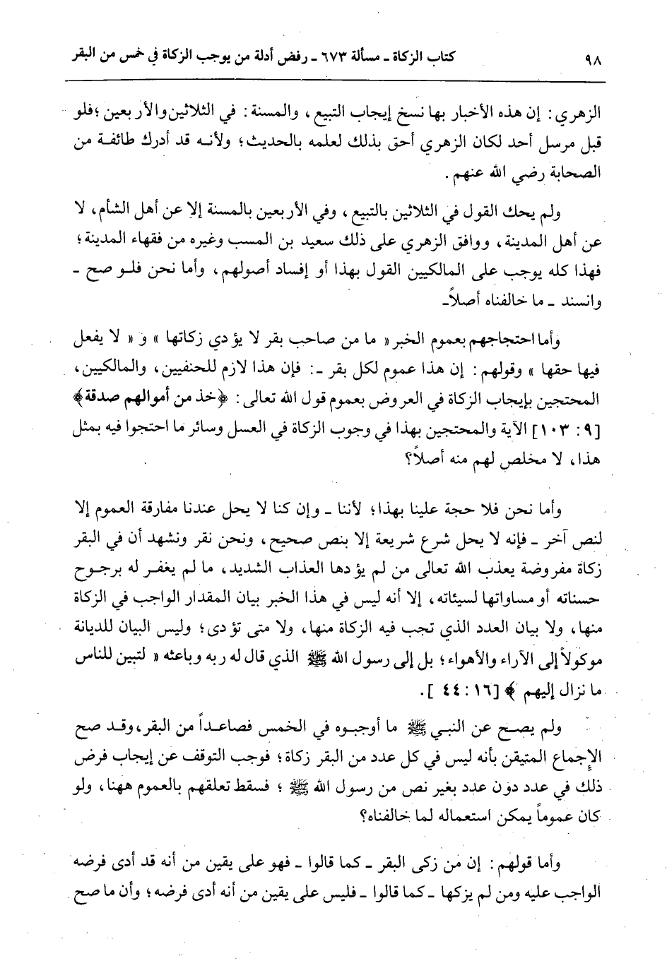 وَلَمْ يَحْكِ الْقَوْلَ فِي الثَّلَاثِينَ بِالتَّبِيعِ، وَفِي الْأَرْبَعِينَ بِالْمُسِنَّةِ إلَّا عَنْ أَهْلِ الشَّامِ، لَا عَنْ أَهْلِ الْمَدِينَةِ، وَوَافَقَ الزُّهْرِيَّ عَلَى ذَلِكَ سَعِيدُ بْنُ الْمُسَيِّبِ وَغَيْرُهُ مِنْ فُقَهَاءِ الْمَدِينَةِ؛ فَهَذَا كُلُّهُ يُوجِبُ عَلَى الْمَالِكِيِّينَ الْقَوْلَ بِهَذَا أَوْ إفْسَادَ أُصُولِهِمْ، وَأَمَّا نَحْنُ فَلَوْ صَحَّ - وَأُسْنِدَ - مَا خَالَفْنَاهُ أَصْلًا - وَأَمَّا احْتِجَاجُهُمْ بِعُمُومِ الْخَبَرِ «مَا مِنْ صَاحِبِ بَقَرٍ لَا يُؤَدِّي زَكَاتَهَا وَلَا يَفْعَلُ فِيهَا حَقَّهَا» وَقَوْلَهُمْ: إنَّ هَذَا عُمُومٌ لِكُلِّ بَقَرٍ -: فَإِنَّ هَذَا لَازِمٌ لِلْحَنَفِيِّينَ، وَالْمَالِكِيِّينَ، الْمُحْتَجِّينَ بِإِيجَابِ الزَّكَاةِ فِي الْعُرُوضِ بِعُمُومِ قَوْلِ اللَّهِ تَعَالَى: {خُذْ مِنْ أَمْوَالِهِمْ صَدَقَةً} [التوبة: 103] الْآيَةُ وَالْمُحْتَجِّينَ بِهَذَا فِي وُجُوبِ الزَّكَاةِ فِي الْعَسَلِ وَسَائِرِ مَا احْتَجُّوا فِيهِ بِمِثْلِ هَذَا، لَا مُخَلِّصَ لَهُمْ مِنْهُ أَصْلًا؟ وَأَمَّا نَحْنُ فَلَا حُجَّةَ عَلَيْنَا بِهَذَا؛ لِأَنَّنَا - وَإِنْ كُنَّا لَا يَحِلُّ عِنْدَنَا مُفَارِقَةُ الْعُمُومِ إلَّا لِنَصٍّ آخَرَ - فَإِنَّهُ لَا يَحِلُّ شَرْعُ شَرِيعَةٍ إلَّا بِنَصٍّ صَحِيحٍ، وَنَحْنُ نُقِرُّ وَنَشْهَدُ أَنَّ فِي الْبَقَرِ زَكَاةً مَفْرُوضَةً يُعَذِّبُ اللَّهُ تَعَالَى مَنْ لَمْ يُؤَدِّهَا الْعَذَابَ الشَّدِيدَ، مَا لَمْ يَغْفِرْ لَهُ بِرُجُوحِ حَسَنَاتِهِ أَوْ مُسَاوَاتِهَا لِسَيِّئَاتِهِ، إلَّا أَنَّهُ لَيْسَ فِي هَذَا الْخَبَرِ بَيَانُ الْمِقْدَارِ الْوَاجِبِ فِي الزَّكَاةِ مِنْهَا، وَلَا بَيَانَ الْعَدَدِ الَّذِي تَجِبُ فِيهِ الزَّكَاةُ مِنْهَا، وَلَا مَتَى تُؤَدَّى؛ وَلَيْسَ الْبَيَانُ لِلدِّيَانَةِ مَوْكُولًا إلَى الْآرَاءِ وَالْأَهْوَاءِ؛ بَلْ إلَى رَسُولِ اللَّهِ - صَلَّى اللَّهُ عَلَيْهِ وَسَلَّمَ - الَّذِي قَالَ لَهُ رَبُّهُ وَبَاعِثُهُ {لِتُبَيِّنَ لِلنَّاسِ مَا نُزِّلَ إِلَيْهِمْ} [النحل: 44] .