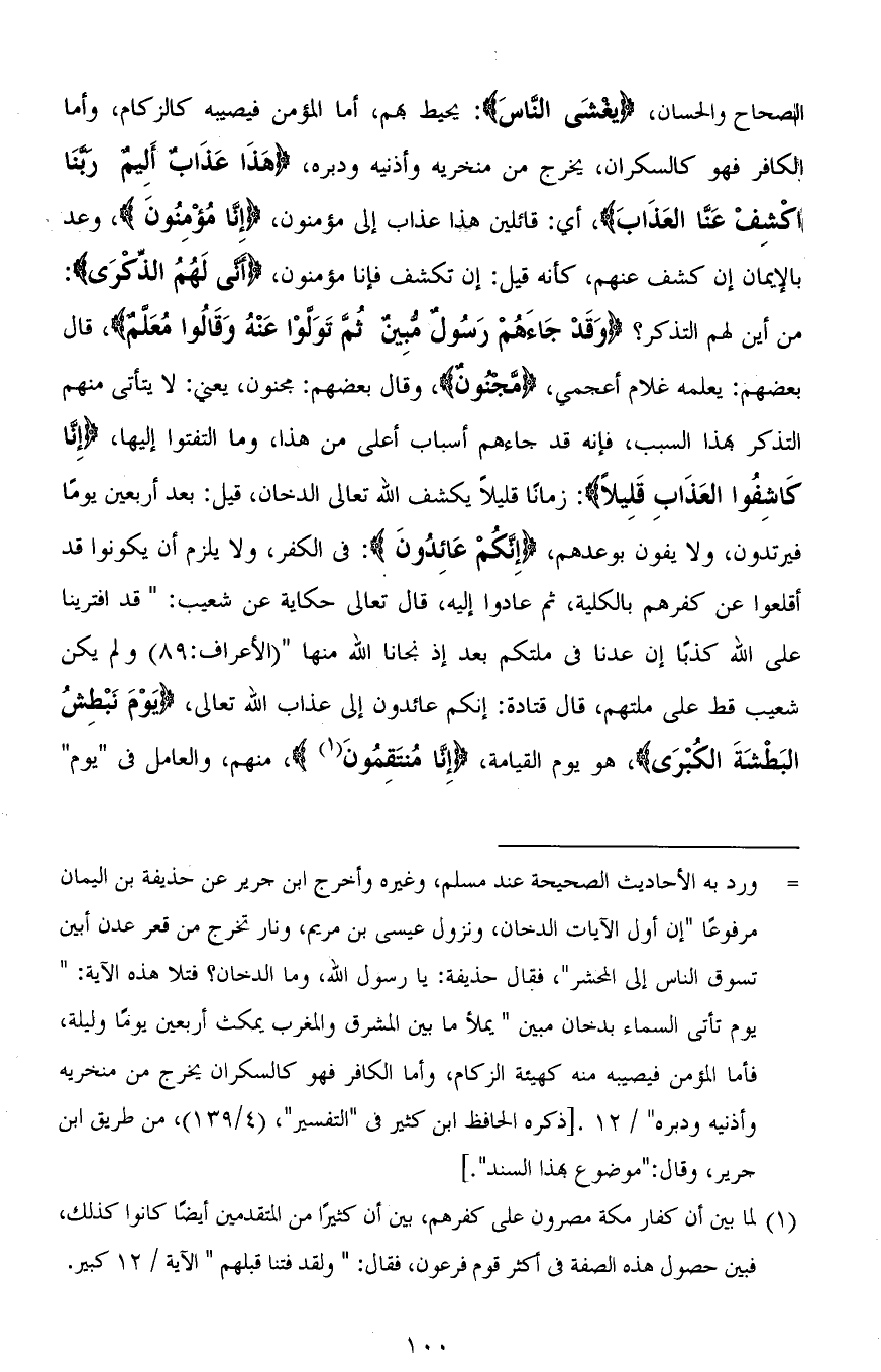 الصحاح والحسان، (يغشَى النَّاسَ): يحيط بهم، أما المؤمن فيصيبه كالزكام، وأما الكافر فهو كالسكران، يخرج من منخريه وأذنيه ودبره، (هَذَا عَذَابٌ أَلِيم رَبَّنَا اكْشِفْ عَنَّا الْعَذَابَ)، أي: قائلين هذا عذاب إلى مؤمنون، (إِنَّا مُؤْمِنُونَ)، وعد بالإيمان إن كشف عنهم، كأنه قيل: إن تكشف فإنا مؤمنون، (أَنَّى لَهُمُ الذِّكْرَى): من أين لهم التذكر؟ (وَقَدْ جَاءَهُمْ رَسُولٌ مُبِينٌ ثُمَّ تَوَلَّوْا عَنْهُ وَقَالُوا مُعَلَّمٌ)، قال بعضهم: يعلمه غلام أعجمي، (مَّجنونٌ)، وقال بعضهم: مجنون، يعني: لا يتأتى منهم التذكر بهذا السبب، فإنه قد جاءهم أسباب أعلى من هذا، وما التفتوا إليها، (إِنَّا كَاشِفُو الْعَذَابِ قَلِيلًا): زمانًا قليلاً يكشف الله تعالى الدخان، قيل: بعد أربعين يومًا فيرتدون، ولا يفون بوعدهم، (إِنَّكُمْ عَائِدُونَ): في الكفر، ولا يلزم أن يكونوا قد أقلعوا عن كفرهم بالكلية، ثم عادوا إليه، قال تعالى حكاية عن شعيب: (قَدِ افْتَرَيْنَا عَلَى اللهِ كَذِبًا إِنْ عُدْنَا فِي مِلَّتِكُمْ بَعْدَ إِذْ نَجَّانَا اللهُ مِنْهَا) [الأعراف: 89] ولم يكن شعيب قط على ملتهم، قال قتادة: إنكم عائدون إلى عذاب الله تعالى، (يَوْمَ نَبْطِشُ الْبَطْشَةَ الْكُبْرَى)، هو يوم القيامة، (إِنَّا مُنْتَقِمُونَ)، منهم، والعامل في " يوم "