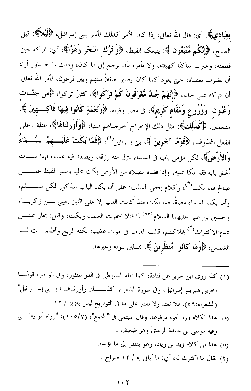 بِعِبَادِي)، أي: قال الله تعالى، إذا كان الأمر كذلك فأسر ببني إسرائيل، (لَيْلاً): قبل الصبح، (إِنَّكُم مُّتَّبَعُونَ): يتبعكم القبط، (وَاتْرُكِ البَحْرَ رَهْوًا)، أي: اتركه حين قطعته، وعبرت ساكنًا كهيئته، ولا تأمره بأن يرجع إلى ما كان، وذلك لما جاوز أراد أن يضرب بعصاه، حتى يعود كما كان ليصير حائلاً بينهم وبين فرعون، فأمر الله تعالى أن يتركه على حاله، (إِنَّهُمْ جُندٌ مغْرَقُونَ كَمْ تَرَكُوا)، كثيرًا تركوا، (مِن جَنَّات وَعُيُونٍ وَزُرُوعٍ وَمَقَامٍ كَرِيمٍ)، في مصر وقراه، (وَنَعْمَةٍ كَانُوا فِيهَا فَاكِهِينَ): متنعمين، (كَذَلِكَ): مثل ذلك الإخراج أخرجناهم منها، (وَأَوْرَثناهَا)، عطف على الفعل المحذوف، (قَوْمًا آخَرِينَ)، بني إسرائيل، (فمَا بَكَتْ عَلَيْهِمُ السَّمَاءُ وَالأَرْضُ)، لكل مؤمن باب في السماء ينزل منه رزقه، ويصعد فيه عمله، فإذا مات أغلق بابه فقد بكا عليه، وإذا فقده مصلاه من الأرض بكت عليه وليس لقبط عمل صالح فما بكت، وكلام بعض السلف: على أن بكاء الباب المذكور لكل مسلم، وأما بكاء السماء مطلقًا فما بكت منذ كانت الدنيا إلا على اثنين يحيى بن زكريا، وحسين بن عليٍّ عليهما السلام (1) لما قتلا احمرت السماء وبكت، وقيل: مجاز عن عدم الاكتراث بهلاكهم، قالت العرب في موت عظيم: بكته الريح وأظلمت له الشمس، (وَمَا كَانُوا مُنظَرِينَ): ممهلين لتوبة وغيرها.