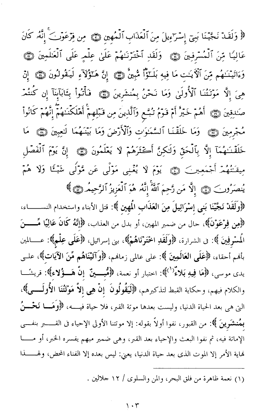 (وَلَقَدْ نَجَّيْنَا بَنِي إِسْرَائِيلَ مِنَ الْعَذَابِ الْمُهِينِ): قتل الأبناء واستخدام النساء، (مِن فِرْعَوْنَ)، حال من ضمير المهين، أو بدل من العذاب، (إِنَّهُ كَانَ عَالِيًا مِنَ الْمُسْرِفِينَ): في الشرارة، (وَلَقَدِ اخْتَرْنَاهُمْ)، بني إسرائيل، (عَلَى عِلْمٍ): عالمين بأنَّهم أحقاء، (عَلَى الْعَالَمِينَ): على عالمي زمانهم، (وَآتَيْنَاهُمْ مِنَ الْآيَاتِ)، على يدي موسى، (مَا فِيهِ بَلاءٌ): اختبار أو نعمة، (مُبِينٌ إِنْ هَؤُلاءِ) قريشًا والكلام فيهم، وحكاية القبط لتذكيرهم، (لَيَقُولُونَ إِنْ هِيَ إِلَّا مَوْتَتُنَا الْأُولَى)، التي هي بعد الحياة الدنيا، وليست بعدها موتة القبر، فلا حياة فيه، (وَمَا نَحْنُ بِمُنْشَرِينَ): من القبور، نفوا أولاً بقوله: إلا موتتنا الأولى الإحياء في القبر بنفي الإماتة فيه، ثم نفوا البعث والإحياء بعد القبر، وهي ضمير مبهم يفسره الخبر، أو ما نهاية الأمر إلا الموت الذي بعد حياة الدنيا، يعني: ليس بعده إلا الفناء المحض، ولهذا