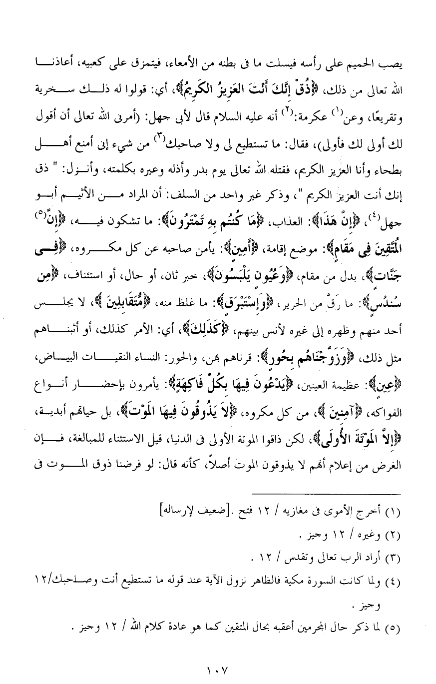 يصب الحميم على رأسه فيسلت ما في بطنه من الأمعاء، فيتمزق على كعبيه، أعاذنا الله تعالى من ذلك، (ذُقْ إِنَّكَ أَنْتَ الْعَزِيزُ الْكَرِيمُ)، أي: قولوا له ذلك سخرية وتقريعًا، وعن عكرمة: أنه عليه السلام قال لأبي جهل: (أمرني الله تعالى أن أقول لك أولى لك فأولى)، فقال: ما تستطيع لي ولا صاحبك من شيء إنى أمنع أهل بطحاء وأنا العزيز الكريم، فقتله الله قعالى يوم بدر وأذله وعيره بكلمته، وأنزل: (ذُقْ إِنَّكَ أَنْتَ الْعَزِيزُ الْكَرِيمُ)، وذكر غير واحد من السلف: أن المراد من الأثيم أبو جهل، (إِنَّ هَذَا): العذاب، (مَا كنتُم بهِ تَمْتَرُونَ): ما تشكون فيه، (إِنَّ الُمتقِينَ فِي مَقَامٍ): موضع إقامة، (أَمِين): يَأمن صاحبه عن كل مكروه، (فِي جَنَّاتٍ)، بدل من مقام، (وَعُيُونٍ يَلْبَسُونَ)، خبر ثان، أو حال، أو استئناف، (مِن سنُدُسٍ): ما رَقَّ من الحرير، (وَإِسْتبْرَقٍ): ما غلظ منه، (مُّتَقَابِلِينَ)، لا يجلس أحد منهم وظهره إلى غيره لأنس بينهم، (كَذَلِكَ)، أي: الأمر كذلك، أو أثبناهم مثل ذلك، (وَزَوجْنَاهُم بحُورٍ): قرناهم بهن، والحور: النساء النقيات البياض، (عِينٍ): عظيمة العينين، (يَدْعُونَ فِيهَا بِكُلِّ فَاكِهَةٍ): يأمرون بإحضار أنواع الفواكه، (آمِنينَ)، من كل مكروه، (لاَ يَذُوقُونَ فِيهَا المَوْتَ)، بل حياتهم أبدية، (إِلَّا الْمَوْتَةَ الْأُولَى)، لكن ذاقوا الموتة الأولى في الدنيا، قيل الاستثناء للمبالغة، فإن الغرض من إعلام أنَّهم لا يذوقون الموت أصلاً، كأنه قال: لو فرضنا ذوق الموت في