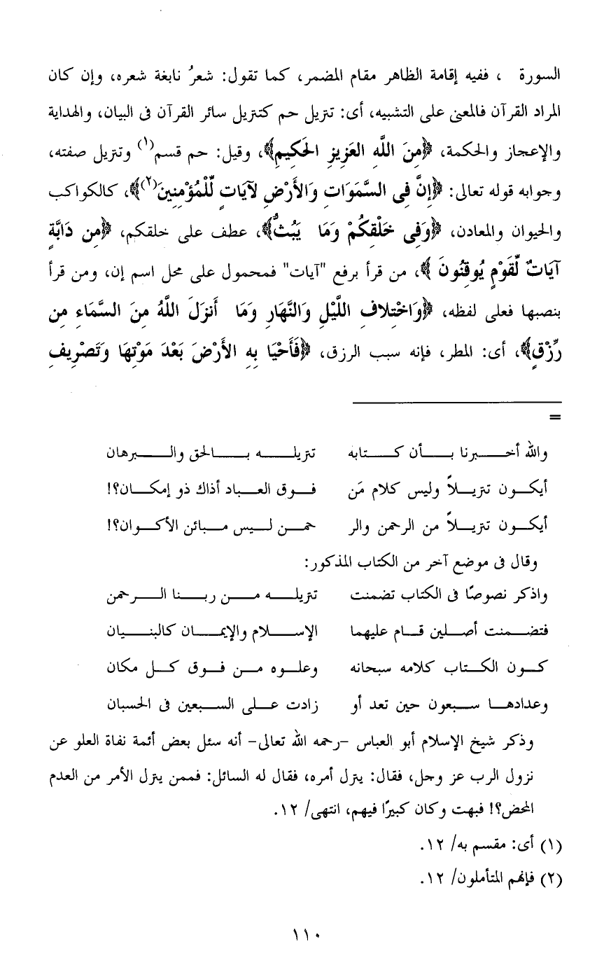 السورة، ففيه إقامة الظاهر مقام المضمر، كما تقول: شعرُ نابغة شعره، وإن كان المراد القرآن فالمعنى على التشبيه، أي: تنزيل حم كتنزيل سائر القرآن في البيان، والهداية والإعجاز والحكمة، (مِنَ اللهِ العَزِيزِ الحَكِيمِ)، وقيل: حم قسم وتنزيل صفته، وجوابه قوله تعالى: (إِنَّ فِي السَّمَاوَاتِ وَالأَرْضِ لَآيَاتٍ للْمُؤْمِنِينَ)، كالكواكب والحيوان والمعادن، (وَفِي خَلْقِكُمْ وَمَا يَبُثُّ)، عطف على خلقكم، (مِنْ دَابَّةٍ آيَاتٌ لِقَوْمٍ يُوقِنُونَ)، من قرأ برفع (آياتٌ) فمحمول على محل اسم إن، ومن قرأ بنصبها فعلى لفظه، (وَاخْتِلَافِ اللَّيْلِ وَالنَّهَارِ وَمَا أَنْزَلَ اللهُ مِنَ السَّمَاءِ مِنْ رِزْقٍ)، أي: المطر، فإنه سبب الرزق، (فَأَحْيَا بِهِ الْأَرْضَ بَعْدَ مَوْتِهَا وَتَصْرِيفِ