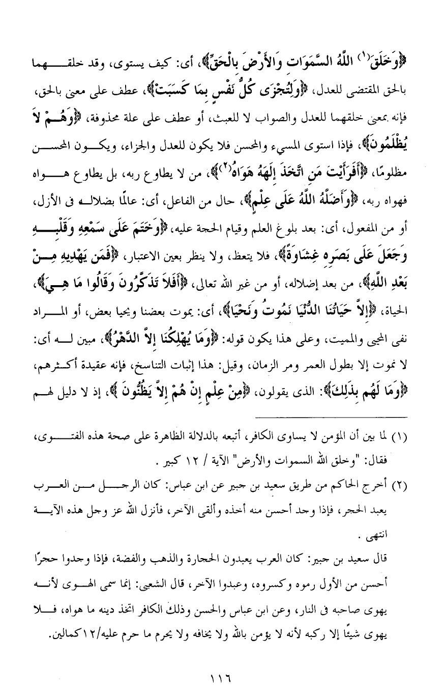 (وَخَلَقَ اللهُ السَّمَاوَاتِ وَالأَرْضَ بِالْحَقِّ)، أي: كيف يستوي، وقد خلقهما بالحق المقتضي للعدل، (وَلِتُجْزَى كُلُّ نَفسٍ بِمَا كَسَبَتْ)، عطف على معنى بالحق، فإنه بمعنى خلقهما للعدل والصواب لا للعبث، أو عطف على علة محذوفة، (وَهُمْ لاَ يُظْلَمُون)، فإذا استوى المسيء والمحسن فلا يكون للعدل والجزاء، ويكون المحسن مظلومًا، (أَفَرَأَيْتَ مَنِ اتَّخَذَ إِلَهَهُ هَوَاهُ)، من لا يطاوع ربه، بل يطاوع هواه فهواه ربه، (وَأَضَلَّهُ اللهُ عَلَى عِلْمٍ)، حال من الفاعل، أي: عالمًا بضلاله في الأزل، أو من المفعول، أي: بعد بلوغ العلم وقيام الحجة عليه، (وَخَتَمَ عَلَى سَمْعِهِ وَقَلْبِه وَجَعَلَ عَلَى بَصَرِهِ غِشَاوَةً)، فلا يتعظ، ولا ينظر بعين الاعتبار، (فَمَن يَهْديهِ مِنْ بَعْدِ اللهِ)، من بعد إضلاله، أو من غير الله تعالى، (أَفَلاَ تَذَكَّرُونَ وَقَالُوا مَا هِيَ)، الحياة، (إِلَّا حَيَاتُنَا الدُّنْيَا نَمُوتُ وَنَحْيَا)، أي: يموت بعضنا ويحيا بعض، أو المراد نفى المحيي والمميت، وعلى هذا يكون قوله: (وَمَا يُهْلِكُنَا إِلَّا الدَّهْرُ)، مبين له أي: لا نموت إلا بطول العمر ومر الزمان، وقيل: هذا إثبات التناسخ، فإنه عقيدة أكثرهم، (وَمَا لَهُم بِذَلِكَ): الذي يقولون، (مِنْ عِلْمٍ إِنْ هُمْ إِلَّا يَظُنُّونَ)، إذ لا دليل لهم