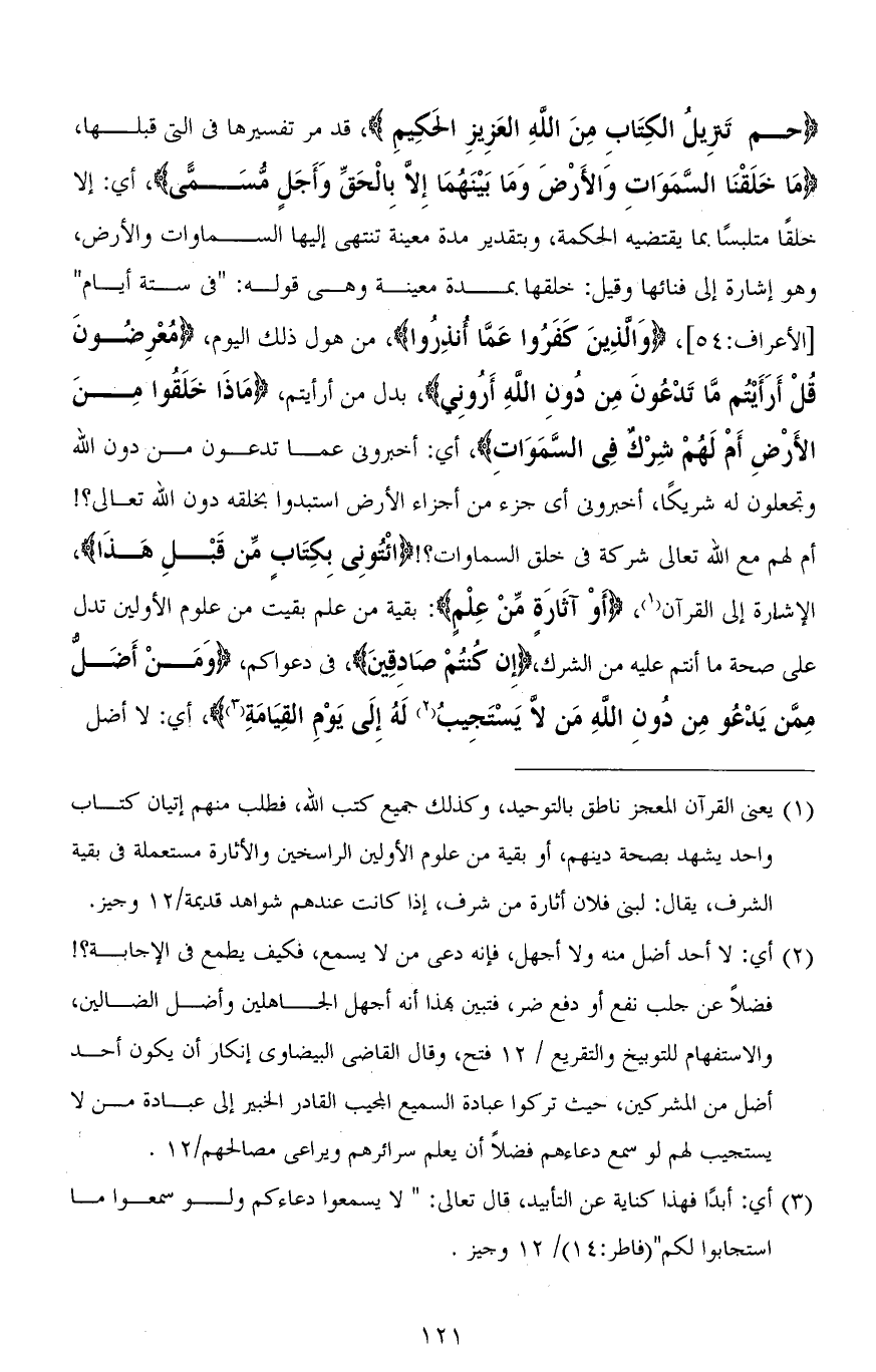 (حم تَنْزِيلُ الْكِتَابِ مِنَ اللهِ الْعَزِيزِ الْحَكِيمِ)، قد مر تفسيرها في التي قبلها، (مَا خَلَقْنا السَّمَاوَاتِ وَالأَرضَ وَمَا بَيْنَهُمَا إِلا بِالْحَقِّ وَأَجَلٍ مسَمًّى)، أي: إلا خلقًا متلبسًا بما يقتضيه الحكمة، وبتقدير مدة معينة تنتهي إليها السماوات والأرض، وهو إشارة إلى فنائها وقيل: خلقها بمدة معينة وهي قوله: " فى ستة أيام " [الأعراف: 54]، (وَالَّذِينَ كَفَرُوا عَمَّا أُنذِرُوا)، من هول ذلك اليوم، (مُعْرِضُونَ قُلْ أَرَأَيْتُم مَّا تَدْعُونَ مِن دُونِ اللهِ أَرُونِي)، بدل من أرأيتم، (مَاذَا خَلَقُوا مِن الأَرْضِ أَمْ لَهم شِرْكٌ فِي السَّمَاوَاتِ)، أي: أخبروني عما تدعون من دون الله وتجعلون له شريكًا، أخبروني أي جزء من أجزاء الأرض استبدوا بخلقه دون الله تعالى؟! أم لهم مع الله تعالى شركة في خلق السماوات؟! (ائْتُونِي بِكِتَابٍ من قَبْلِ هَذَا)، الإشارة إلى القرآن، (أَوْ أَثَارَةٍ مِنْ عِلْمٍ): بقية من علم بقيت من علوم الأولين تدل على صحة ما أنتم عليه من الشرك، (إِن كُنتُمْ صَادِقِينَ)، في دعواكم، (وَمَنْ أَضَلُّ مِمَّنْ يَدْعُو مِنْ دُونِ اللهِ مَنْ لَا يَسْتَجِيبُ لَهُ إِلَى يَوْمِ الْقِيَامَةِ)، أي: لا أضل