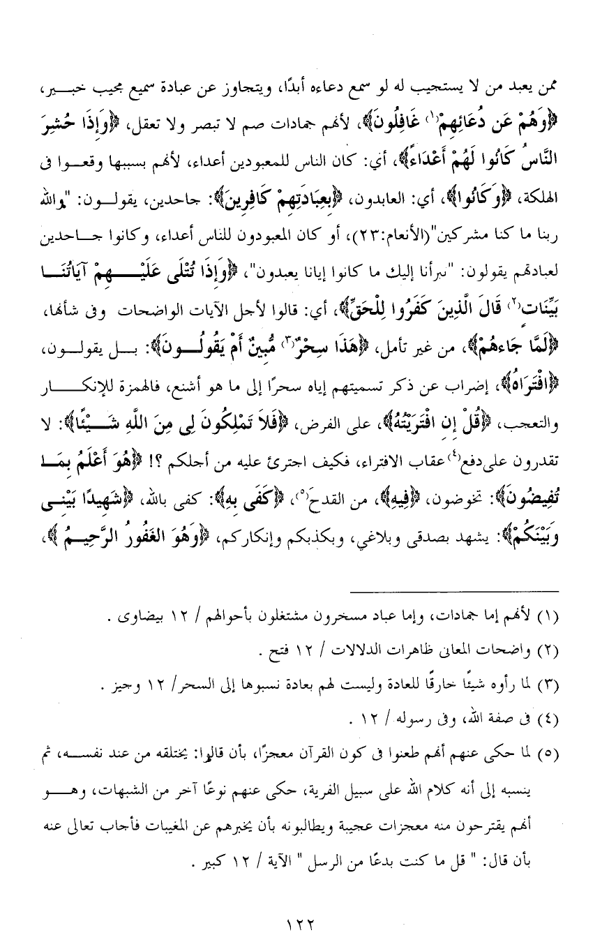 ممن يعبد من لا يستجيب له لو سمع دعاءه أبدًا، ويتجاوز عن عبادة سميع مجيب خبير، (وَهُمْ عَنْ دُعَائِهِمْ غَافِلُونَ)، لأنهم جمادات صم لا تبصر ولا تعقل، (وَإِذَا حُشِرَ النَّاسُ كَانوا لَهُمْ أَعْدَاءً)، أي: كان الناس للمعبودين أعداء، لأنهم بسببها وقعوا في الهلكة، (وَكانوا)، أي: العابدون، (بِعِبَادَتِهِمْ كَافِرِينَ): جاحدين، يقولون: (والله ربنا ما كنا مشركين) [الأنعام: 23]، أو كان المعبودون للناس أعداء، وكانوا جاحدين لعبادتهم يقولون: " تبرأنا إليك ما كانوا إيانا يعبدون "، (وَإِذَا تُتْلَى عَلَيْهِمْ آيَاتُنَا بَيِّنَاتٍ قَالَ الَّذِينَ كَفَرُوا لِلْحَقِّ)، أي: قالوا لأجل الآيات الواضحات وفي شأنها، (لَمَّا جَاءَهُمْ)، من غير تأمل، (هَذَا سِحْرٌ مُّبِينٌ أَمْ يَقُولُونَ): بل يقولون، (افتَرَاهُ)، إضراب عن ذكر تسميتهم إياه سحرًا إلى ما هو أشنع، فالهمزة للإنكار والتعجب، (قُلْ إِنِ افْتَرَيْتُهُ)، على الفرض، (فَلَا تَمْلِكُونَ لِي مِنَ اللهِ شَيْئًا): لا تقدرون على دفع عقاب الافتراء، فكيف اجترئ عليه من أجلكم؟! (هُوَ أَعْلَمُ بِمَا تُفِيضُونَ): تخوضون، (فِيهِ)، من القدح، (كَفَى بِهِ): كفى باللهِ، (شَهِيدًا بَيْنِي وَبَيْنَكُمْ): يشهد بصدقي وبلاغي، وبكذبكم وإنكاركم، (وَهُوَ الْغَفُورُ الرَّحِيمُ)،