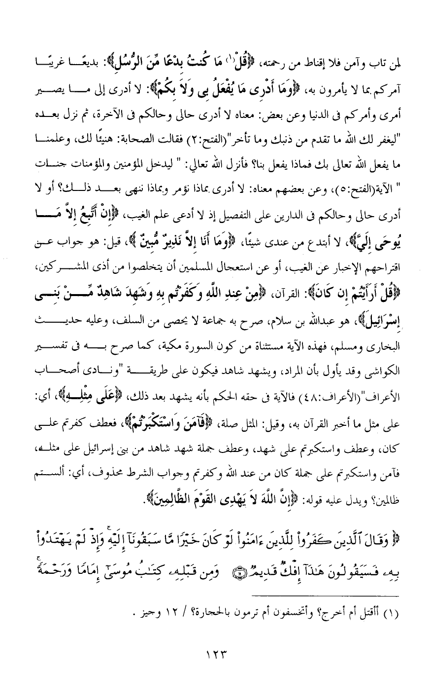 لمن تاب وآمن فلا إقناط من رحمته، (قُلْ مَا كُنْتُ بِدْعًا مِنَ الرُّسُلِ): بديعًا غريبًا آمركم بما لا يأمرون به، (وَمَا أَدْرِي مَا يُفْعَلُ بِي وَلَا بِكُمْ): لا أدري إلى ما يصير أمري وأمركم في الدنيا وعن بعض: معناه لا أدري حالي وحالكم في الآخرة، ثم نزل بعده " ليغفر لك الله ما تقدم من ذنبك وما تأخر " [الفتح: 2] فقال الصحابة: هنيئًا لك، وعلمنا ما يفعل الله تعالى بك فماذا يفعل بنا؟ فأنزل الله تعالي: (ليدخل المؤمنين والمؤمنات جنات) الآية [الفتح: 5]، وعن بعضهم معناه: لا أدرى بماذا نؤمر وبماذا ننهي بعد ذلك؟ أو لا أدري حالى وحالكم في الدارين على التفصيل إذ لا أدعي علم الغيب، (إِنْ أَتَّبِعُ إِلَّا مَا يُوحَى إِلَيَّ)، لا أبتدع من عندي شيئًا، (وَمَا أَنَا إِلَّا نَذِيرٌ مُبِينٌ)، قيل: هو جواب عن اقتراحهم الإخبار عن الغيب، أو عن استعجال المسلمين أن يتخلصوا من أذى المشركين، (قُلْ أَرَأَيتمْ إِن كَانَ): القرآن، (مِنْ عِنْدِ اللهِ وَكَفَرْتُمْ بِهِ وَشَهِدَ شَاهِدٌ مِنْ بَنِي إِسْرَائِيلَ)، هو عبد الله بن سلام، صرح به جماعة لا يحصى من السلف، وعليه حديث البخاري ومسلم، فهذه الآية مستثناة من كون السورة مكية، كما صرح به في تفسير الكواشي وقد يأول بأن المراد، ويشهد شاهد فيكون على طريقة (ونادى أصحاب الأعراف) [الأعراف: 48] فالآية في حقه الحكم بأنه يشهد بعد ذلك، (عَلَى مِثْلِهِ)، أي: على مثل ما أخبر القرآن به، وقيل: المثل صلة، (فَآمَنَ وَاسْتَكْبَرْتُمْ)، فعطف كفرتم على كان، وعطف واستكبرتم على شهد، وعطف جملة شهد شاهد من بني إسرائيل على مثله، فآمن واستكبرتم على جملة كان من عند الله وكفرتم وجواب الشرط محذوف، أي: ألستم ظالمين؟ ويدل عليه قوله: (إِنَّ اللهَ لَا يَهْدِي الْقَوْمَ الظَّالِمِينَ).
