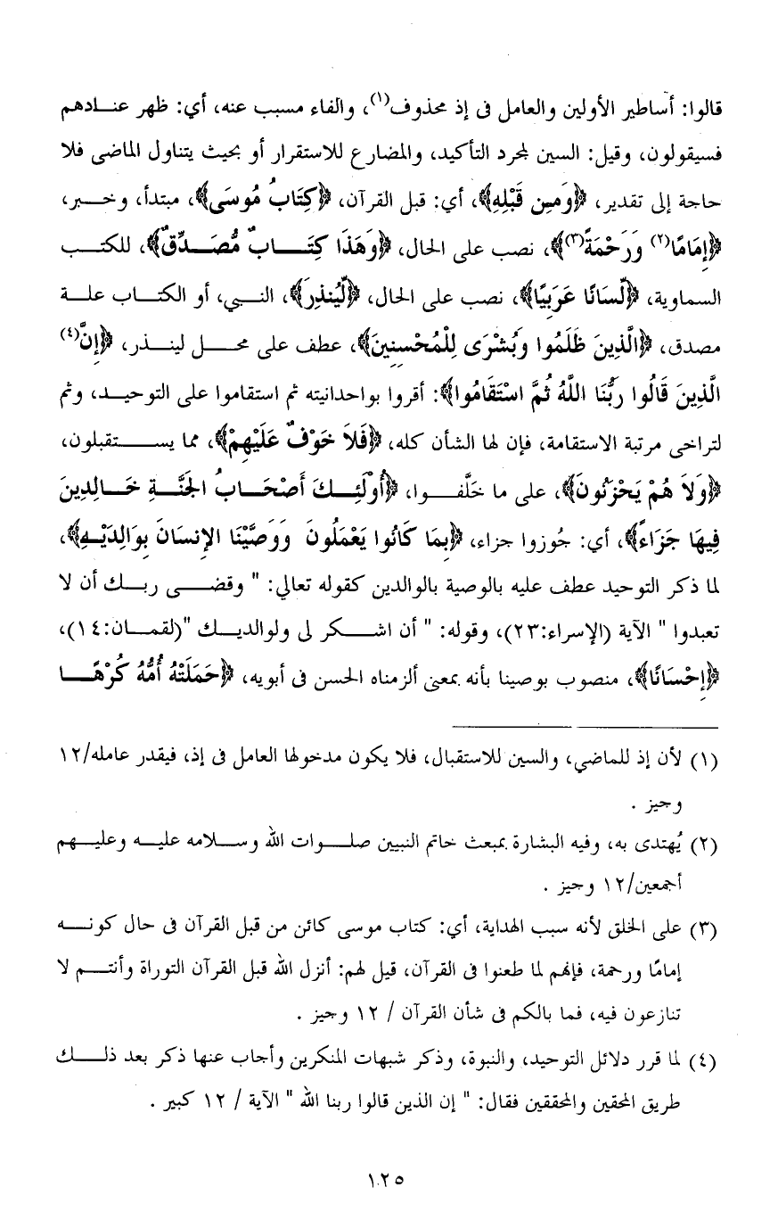 قالوا: أساطير الأولين والعامل في إذ محذوف، والفاء مسبب عنه، أي: ظهر عنادهم فسيقولون، وقيل: السين لمجرد التأكيد، والمضارع للاستقرار أو بحيث يتناول الماضي فلا حاجة إلى تقدير، (وَمِن قَبْلِهِ)، أي: قبل القرآن، (كِتابُ مُوسَى)، مبتدأ، وخبر، (إِمَامًا وَرَحْمَةً)، نصب على الحال، (وَهَذَا كِتَابٌ مُصَدِّقٌ)، للكتب السماوية، (لِسَانًا عَرَبِيًّا)، نصب على الحال، (لِيُنْذِرَ)، النبي، أو الكتاب علة مصدق، (الَّذِينَ ظَلَمُوا وَبُشْرَى لِلْمُحْسِنِينَ)، عطف على محل لينذر، (إِنَّ الَّذِينَ قَالُوا رَبُّنَا اللهُ ثُمَّ اسْتَقَامُوا): أقروا بواحدانيته ثم استقاموا على التوحيد، وثم لتراخي مرتبة الاستقامة، فإن لها الشأن كله، (فَلَا خَوْفٌ عَلَيْهِمْ)، مما يستقبلون، (وَلَا هُمْ يَحْزَنُونَ)، على ما خَلَّفوا، (أُولَئِكَ أَصْحَابُ الجَنةِ خَالِدِينَ فِيهَا جَزَاءً)، أي: جُوزوا جزاء، (بِمَا كَانُوا يَعْمَلُونَ وَوَصَّيْنَا الْإِنْسَانَ بِوَالِدَيْهِ)، لما ذكر التوحيد عطف عليه بالوصية بالوالدين كقوله تعالي: (وَقَضَى رَبُّكَ أَلَّا تَعْبُدُوا [إِلَّا إِيَّاهُ]) الآية [الإسراء: 23]، وقوله: (أن اشكر لي ولوالديك) [لقمان: 14]، (إِحْسَانًا)، منصوب بـ وصينا بأنه بمعنى ألزمناه الحسن في أبويه، (حَمَلَتْهُ أُمُّهُ كُرْهًا