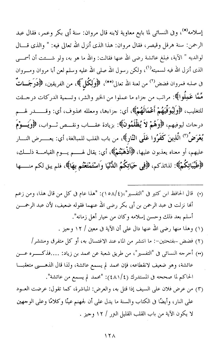 إسلامه، وفي النسائي لما بايع معاوية لابنه قال مروان: سنة أبي بكر وعمر، فقال عبد الرحمن: سنة هرقل وقيصر، فقال مروان: هذا الذي أنزل الله تعالى فيه: " والذي قال لوالديه " الآية، فبلغ عائشة رضي الله عنها فقالت: والله ما هو به، ولو شئت أن أسمي الذي أنزل الله فيه لسميته، ولكن رسول الله صلى الله عليه وسلم لعن أبا مروان ومروان فى صلبه فمروان فضض من لعنة الله تعالى، (وَلِكُلٍّ)، من الفريقين، (دَرَجَاتٌ مِّمَّا عَمِلُوا): مراتب من جزاء ما عملوا من الخير والشر، وتسمية الدركات درجات للتغليب، (وَلِيُوَفِّيَهُمْ أَعْمَالَهُمْ)، أي: جزاءها، ومعلله محذوف، أي: وقدر لهم درجات ليوفيهم، (وَهُمْ لَا يُظْلَمُونَ): بزيادة عقاب ونقص ثواب، (وَيَوْمَ يُعْرَضُ الَّذِينَ كَفَرُوا عَلَى النَّارِ)، من باب القلب للمبالغة، أي: يعرض النار عليهم، أو معناه يعذبون عليها، (أَذْهَبْتُمْ)، أي: يقال لهم يوم القيامة ذلك، (طَيِّبَاتِكُمْ): لذائذكم، (فِي حَيَاتِكُمُ الدُّنْيَا وَاسْتَمْتَعْتُمْ بِهَا)، فلم يبق لكم منها