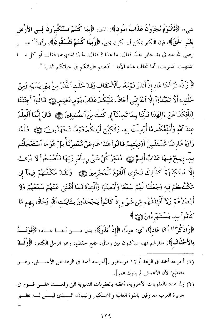 (وَاذْكُرْ أَخَا عَادٍ إِذْ أَنْذَرَ قَوْمَهُ بِالْأَحْقَافِ وَقَدْ خَلَتِ النُّذُرُ مِنْ بَيْنِ يَدَيْهِ وَمِنْ خَلْفِهِ أَلَّا تَعْبُدُوا إِلَّا اللهَ إِنِّي أَخَافُ عَلَيْكُمْ عَذَابَ يَوْمٍ عَظِيمٍ (21) قَالُوا أَجِئْتَنَا لِتَأْفِكَنَا عَنْ آلِهَتِنَا فَأْتِنَا بِمَا تَعِدُنَا إِنْ كُنْتَ مِنَ الصَّادِقِينَ (22) قَالَ إِنَّمَا الْعِلْمُ عِنْدَ اللهِ وَأُبَلِّغُكُمْ مَا أُرْسِلْتُ بِهِ وَلَكِنِّي أَرَاكُمْ قَوْمًا تَجْهَلُونَ (23) فَلَمَّا رَأَوْهُ عَارِضًا مُسْتَقْبِلَ أَوْدِيَتِهِمْ قَالُوا هَذَا عَارِضٌ مُمْطِرُنَا بَلْ هُوَ مَا اسْتَعْجَلْتُمْ بِهِ رِيحٌ فِيهَا عَذَابٌ أَلِيمٌ (24) تُدَمِّرُ كُلَّ شَيْءٍ بِأَمْرِ رَبِّهَا فَأَصْبَحُوا لَا يُرَى إِلَّا مَسَاكِنُهُمْ كَذَلِكَ نَجْزِي الْقَوْمَ الْمُجْرِمِينَ (25) وَلَقَدْ مَكَّنَّاهُمْ فِيمَا إِنْ مَكَّنَّاكُمْ فِيهِ وَجَعَلْنَا لَهُمْ سَمْعًا وَأَبْصَارًا وَأَفْئِدَةً فَمَا أَغْنَى عَنْهُمْ سَمْعُهُمْ وَلَا أَبْصَارُهُمْ وَلَا أَفْئِدَتُهُمْ مِنْ شَيْءٍ إِذْ كَانُوا يَجْحَدُونَ بِآيَاتِ اللهِ وَحَاقَ بِهِمْ مَا كَانُوا بِهِ يَسْتَهْزِءُونَ (26)