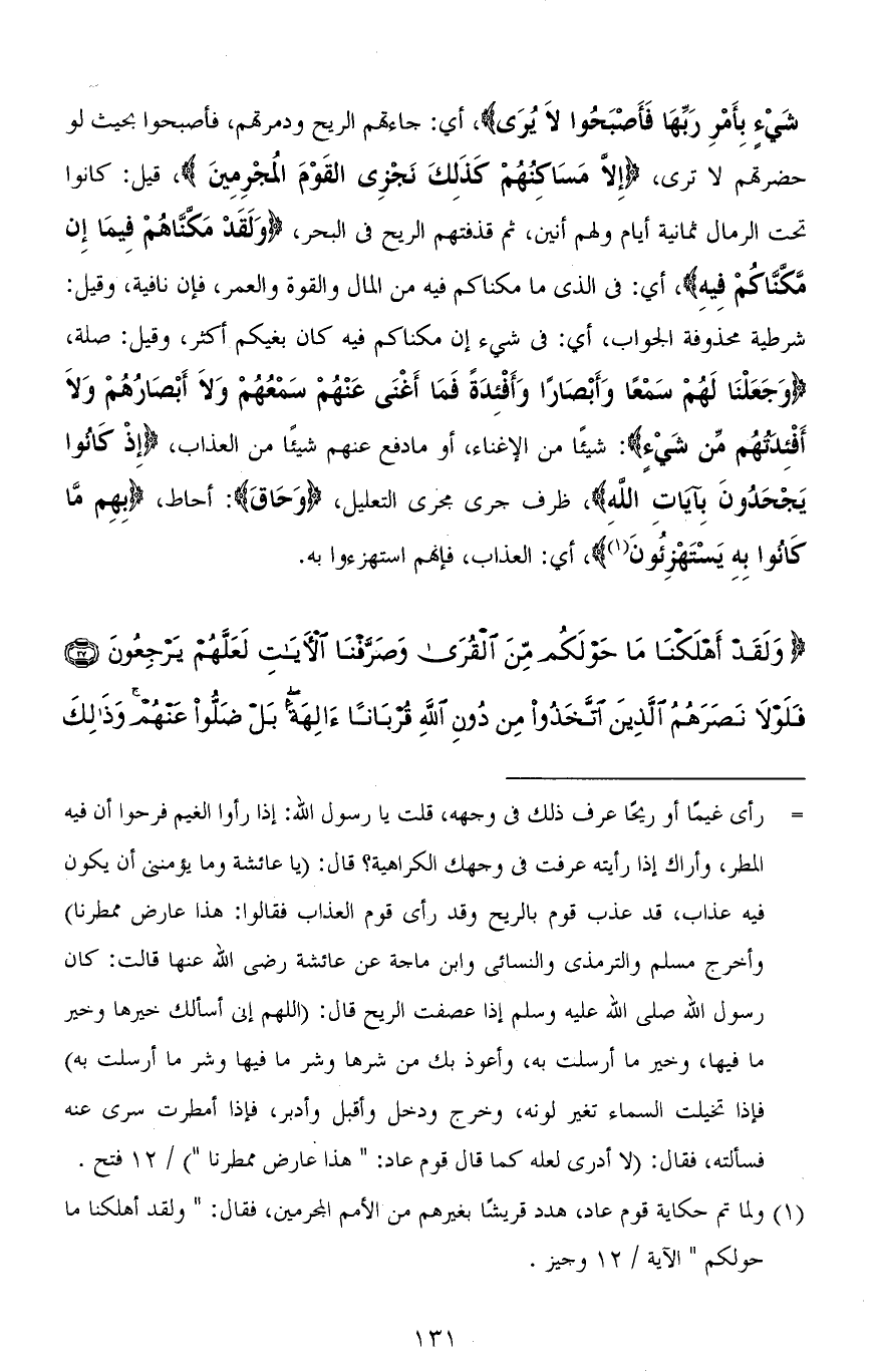 شَيْءٍ بِأَمْرِ رَبِّهَا فَأَصْبَحُوا لَا يُرَى)، أي: جاءتهم الريح ودمرتهم، فأصبحوا بحيث لو حضرتهم لا ترى، (إِلا مَسَاكِنُهُمْ كَذَلِكَ نَجْزِي الْقَوْمَ الْمُجْرِمِينَ)، قيل: كانوا تحت الرمال ثمانية أيام ولهم أنين، ثم قذفتهم الريح في البحر، (وَلَقَدْ مَكَّنَّاهُمْ فِيمَا إِنْ مَكَّنَّاكُمْ فِيهِ)، أي: في الذي ما مكناكم فيه من المال والقوة والعمر، فإن نافية، وقيل: شرطية محذوفة الجواب، أي: في شيء إن مكناكم فيه كان بغيكم أكثر، وقيل: صلة، (وَجَعَلْنَا لَهُمْ سَمْعًا وَأَبْصَارًا وَأَفْئِدَةً فَمَا أَغْنَى عَنْهُمْ سَمْعُهُمْ وَلَا أَبْصَارُهُمْ وَلَا أَفْئِدَتُهُمْ مِنْ شَيْءٍ): شيئًا من الإغناء، أو ما دفع عنهم شيئًا من العذاب، (إِذْ كَانُوا يَجْحَدُونَ بِآيَاتِ اللهِ)، ظرف جرى مجرى التعليل، (وَحَاقَ): أحاط، (بِهِم مَا كَانُوا بِهِ يَسْتَهْزِءُونَ)، أي: العذاب، فإنهم استهزءوا به.