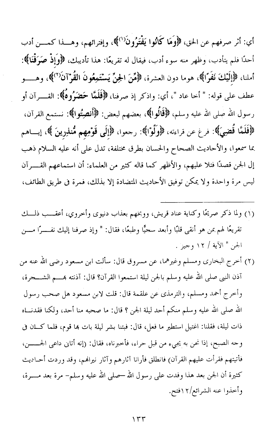 أي: أثر صرفهم عن الحق، (وَمَا كَانُوا يَفْتَرُونَ)، وافترائهم، وهذا كمن أدب أحدًا فلم يتأدب، وظهر منه سوء أدب، فيقال له تقريعًا: هذا تأديبك، (وَإِذ صَرَفنا): أملنا، (إِلَيْكَ نَفَرًا)، هو ما دون العشرة، (مِنَ الْجِنِّ يَسْتَمِعُونَ الْقُرْآنَ)، وهو عطف على قوله: (أخا عادٍ)، أي: واذكر إذ صرفنا، (فَلَمَّا حَضَرُوهُ): القرآن أو رسول الله صلى الله عليه وسلم، (قَالُوا)، بعضهم لبعض: (أَنْصِتُوا): نستمع القرآن، (فَلَمَّا قُضِيَ): فرغ عن قراءته، (وَلَّوْا): رجعوا، (إِلَى قَوْمِهِمْ مُنْذِرِينَ)، إياهم بما سمعوا، والأحاديث الصحاح والحسان بطرق مختلفة، تدل على أنه عليه السلام ذهب إلى الجن قصدًا فتلا عليهم، والأظهر كما قاله كثير من العلماء: أن استماعهم القرآن ليس مرة واحدة ولا يمكن توفيق الأحاديث المتضادة إلا بذلك، فمرة في طريق الطائف،