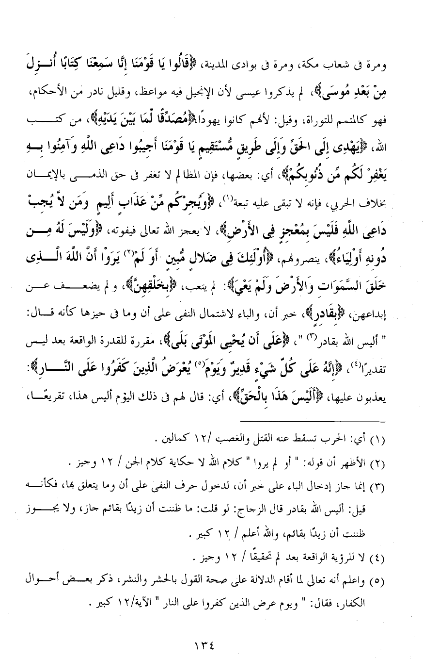 ومرة في شعاب مكة، ومرة في بوادي المدينة، (قَالُوا يَا قَوْمَنَا إِنَّا سَمِعْنَا كِتَابًا أُنْزِلَ مِنْ بَعْدِ مُوسَى)، لم يذكروا عيسى لأن الإنجيل فيه مواعظ، وقليل نادر من الأحكام، فهو كالمتمم للتوراة، وقيل: لأنَّهُم كانوا يهودًا، (مُصَدِّقًا لِمَا بَيْنَ يَدَيْهِ)، من كتب الله، (يَهْدِي إِلَى الْحَقِّ وَإِلَى طَرِيقٍ مُسْتَقِيمٍ يَا قَوْمَنَا أَجِيبُوا دَاعِيَ اللهِ وَآمِنُوا بِهِ يَغْفِرْ لَكُمْ مِنْ ذُنُوبِكُمْ)، أي: بعضها، فإن المظالم لا تغفر في حق الذمي بالإيمان بخلاف الحربي، فإنه لا تبقى عليه تبعة، (وَيُجِرْكُمْ مِنْ عَذَابٍ أَلِيمٍ وَمَنْ لَا يُجِبْ دَاعِيَ اللهِ فَلَيْسَ بِمُعْجِزٍ فِي الْأَرْضِ)، لا يعجز الله تعالى فيفوته، (وَلَيْسَ لَهُ مِنْ دُونِهِ أَوْلِيَاءُ)، ينصرونهم، (أوْلَئِكَ فِي ضَلالٍ مبِينٍ أَوَلَمْ يَرَوْا أَنَّ الله الَّذِي خَلَقَ السمَاوَاتِ وَالأَرْضَ وَلَمْ يَعْيَ): لم يتعب، (بِخَلْقِهِنَّ)، ولم يضعف عن إبداعهن، (بِقَادرٍ)، خبر أن، والباء لاشتمال النفي على أن وما في حيزها كأنه قال: " أليس الله بقادر "، (عَلَى أَن يُحْيي المَوْتَى بَلَى)، مقررة للقدرة الواقعة بعد ليس تقديرًا، (إِنَّهُ عَلَى كُلِّ شَيْءٍ قَدِيرٌ وَيَوْمَ يُعْرَضُ الَّذِينَ كَفَرُوا عَلَى النَّارِ): يعذبون عليها، (أَلَيْسَ هَذا بِالْحَقِّ)، أي: قال لهم في ذلك اليوم أليس هذا، تقريعًا،