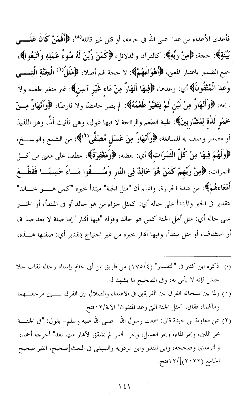 فأعدى الأعداء من عدا على الله في حرمه، أو قتل غير قاتله، (أَفَمَنْ كَانَ عَلَى بَيِّنَةٍ): حجة، (مِنْ رَبِّهِ): كالقرآن والدلائل، (كَمَنْ زُيِّنَ لَهُ سُوءُ عَمَلِهِ وَاتَّبَعُوا)، جمع الضمير باعتبار المعنى، (أَهْوَاءَهُمْ): لا حجة لهم أصلاً، (مَثَلُ الْجَنَّةِ الَّتِي وُعِدَ الْمُتَّقُونَ) أي: وعدها، (فِيهَا أَنْهَارٌ مِنْ مَاءٍ غَيْرِ آسِنٍ): غير متغير طعمه ولا ريحه، (وَأَنْهَارٌ مِنْ لَبَنٍ لَمْ يَتَغَيَّرْ طَعْمُهُ): لم يصر حامضًا ولا قارصًا، (وَأَنْهَارٌ مِنْ خَمْرٍ لَذَّةٍ لِلشَّارِبِينَ): طيبة الطعم والرائحة لا فيها غول، وهي تأنيث لَذ، وهو اللذيذ أو مصدر وصف به للمبالغة، (وَأَنْهَارٌ مِنْ عَسَلٍ مُصَفًّى): من الشمع والوسخ، (وَلَهُمْ فِيهَا مِنْ كُلِّ الثَّمَرَاتِ) أي: بعضه، (وَمَغْفِرَةٌ)، عطف على معنى من كل الثمرات، (مِنْ رَبِّهِمْ كَمَنْ هُوَ خَالِدٌ فِي النَّارِ وَسُقُوا مَاءً حَمِيمًا فَقَطَّعَ أَمْعَاءَهُمْ): من شدة الحرارة، واعلم أن " مثل الجنة " مبتدأ خبره " كمن هو خالد " بتقدير في الخبر والمبتدأ على حاله أي: كمثل جزاء من هو خالد أو في المبتدأ، أو الخبر على حاله أي: مثل أهل الجنة كمن هو خالد وقوله " فيها أنهار " إما صلة لا بعد صلة، أو استئناف، أو مثل مبتدأ، وفيها أنهار خبره من غير احتياج بتقدير أي: صفتها هذه،