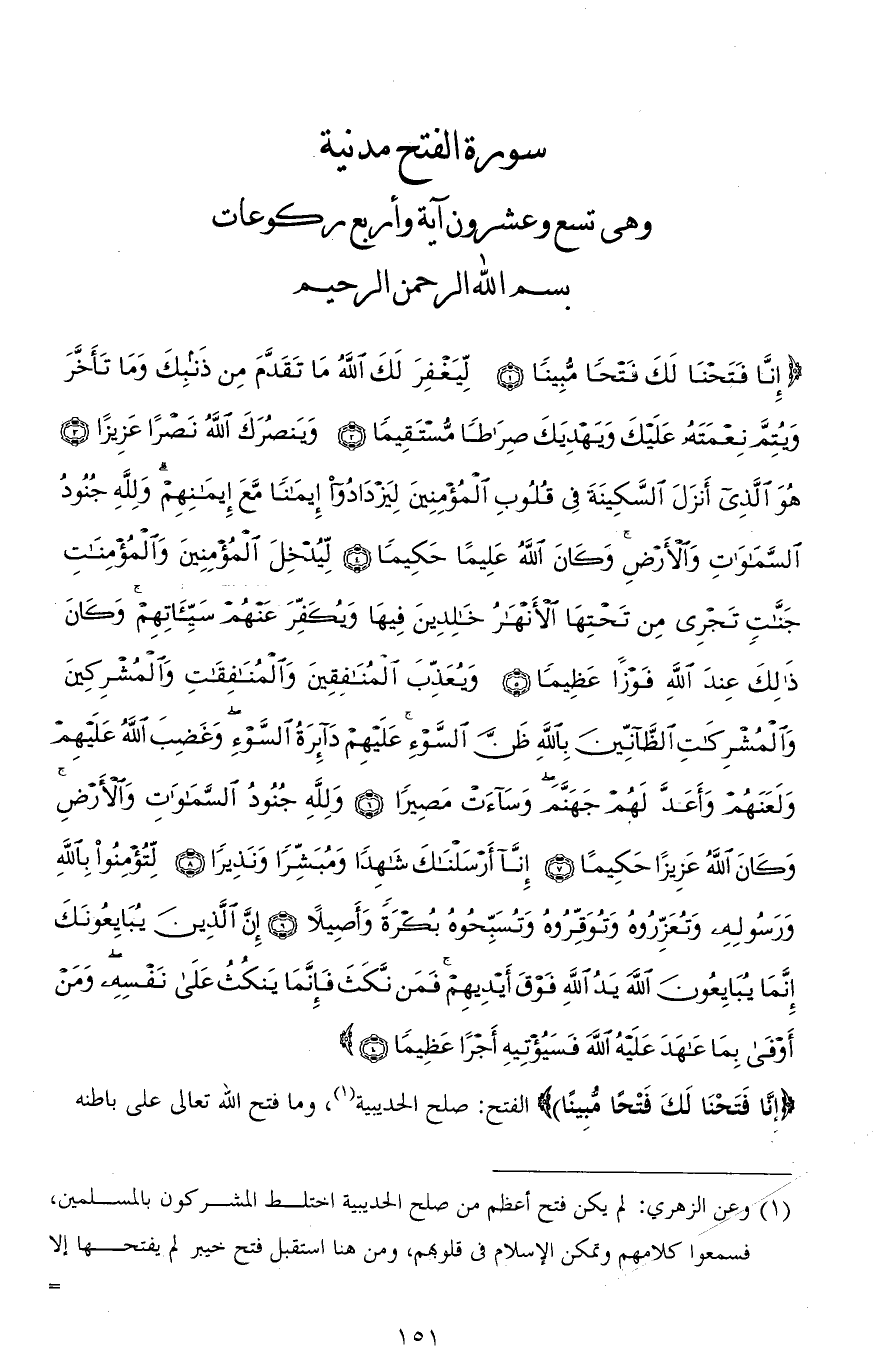 (إِنَّا فَتَحْنَا لَكَ فَتْحًا مُبِينًا (1) لِيَغْفِرَ لَكَ اللهُ مَا تَقَدَّمَ مِنْ ذَنْبِكَ وَمَا تَأَخَّرَ وَيُتِمَّ نِعْمَتَهُ عَلَيْكَ وَيَهْدِيَكَ صِرَاطًا مُسْتَقِيمًا (2) وَيَنْصُرَكَ اللهُ نَصْرًا عَزِيزًا (3) هُوَ الَّذِي أَنْزَلَ السَّكِينَةَ فِي قُلُوبِ الْمُؤْمِنِينَ لِيَزْدَادُوا إِيمَانًا مَعَ إِيمَانِهِمْ وَلله جُنُودُ السَّمَاوَاتِ وَالْأَرْضِ وَكَانَ اللهُ عَلِيمًا حَكِيمًا (4) لِيُدْخِلَ الْمُؤْمِنِينَ وَالْمُؤْمِنَاتِ جَنَّاتٍ تَجْرِي مِنْ تَحْتِهَا الْأَنْهَارُ خَالِدِينَ فِيهَا وَيُكَفِّرَ عَنْهُمْ سَيِّئَاتِهِمْ وَكَانَ ذَلِكَ عِنْدَ اللهِ فَوْزًا عَظِيمًا (5) وَيُعَذِّبَ الْمُنَافِقِينَ وَالْمُنَافِقَاتِ وَالْمُشْرِكِينَ وَالْمُشْرِكَاتِ الظَّانِّينَ بِاللهِ ظَنَّ السَّوْءِ عَلَيْهِمْ دَائِرَةُ السَّوْءِ وَغَضِبَ اللهُ عَلَيْهِمْ وَلَعَنَهُمْ وَأَعَدَّ لَهُمْ جَهَنَّمَ وَسَاءَتْ مَصِيرًا (6) وَلله جُنُودُ السَّمَاوَاتِ وَالْأَرْضِ وَكَانَ اللهُ عَزِيزًا حَكِيمًا (7) إِنَّا أَرْسَلْنَاكَ شَاهِدًا وَمُبَشِّرًا وَنَذِيرًا (8) لِتُؤْمِنُوا بِاللهِ وَرَسُولِهِ وَتُعَزِّرُوهُ وَتُوَقِّرُوهُ وَتُسَبِّحُوهُ بُكْرَةً وَأَصِيلًا (9) إِنَّ الَّذِينَ يُبَايِعُونَكَ إِنَّمَا يُبَايِعُونَ اللهَ يَدُ اللهِ فَوْقَ أَيْدِيهِمْ فَمَنْ نَكَثَ فَإِنَّمَا يَنْكُثُ عَلَى نَفْسِهِ وَمَنْ أَوْفَى بِمَا عَاهَدَ عَلَيْهُ اللهَ فَسَيُؤْتِيهِ أَجْرًا عَظِيمًا (10)