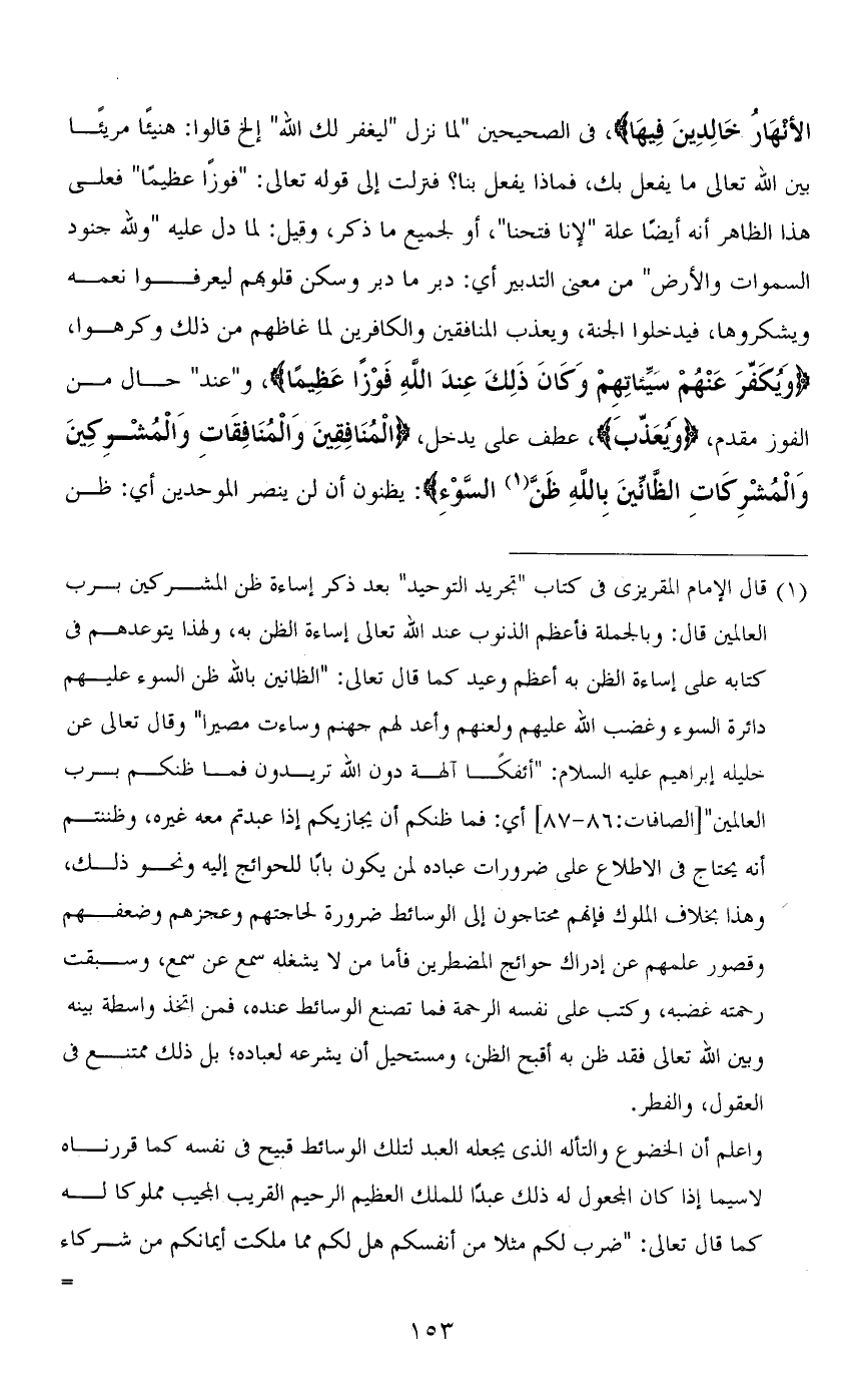 الْأَنْهَارُ خَالِدِينَ فِيهَا)، في الصحيحين " لما نزل " ليغفر لك الله " إلخ قالوا: هنيئًا مريئًا يبن الله تعالى ما يفعل بك، فماذا يفعل بنا؟ فنزلت إلى قوله تعالى: " فوزًا عظيمًا " فعلى هذا الظاهر أنه أيضًا علة " لـ إنَّا فتحنا "، أو لجميع ما ذكر، وقيل: لما دل عليه " ولله جنود السَّمَاوَات والأرض " من معنى التدبير أي: دبر ما دبر وسكن قلوبهم ليعرفوا نعمه ويشكروها، فيدخلوا الجنة، ويعذب المنافقين والكافرين لما غاظهم من ذلك وكرهوا، (وَيُكَفِّرَ عَنْهُمْ سَيِّئَاتِهِمْ وَكَانَ ذَلِكَ عِنْدَ اللهِ فَوْزًا عَظِيمًا)، و " عند " حال من الفوز مقدم، (وَيُعَذِّبَ)، عطف على يدخل، (الْمُنَافِقِينَ وَالْمُنَافِقَاتِ وَالْمُشْرِكِينَ وَالْمُشْرِكَاتِ الظَّانِّينَ بِاللهِ ظَنَّ السَّوْءِ): يظنون أن لن ينصر الموحدين أي: ظن
