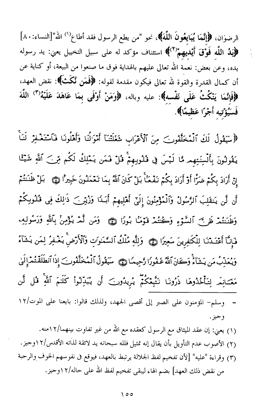 (سَيَقُولُ لَكَ الْمُخَلَّفُونَ مِنَ الْأَعْرَابِ شَغَلَتْنَا أَمْوَالُنَا وَأَهْلُونَا فَاسْتَغْفِرْ لَنَا يَقُولُونَ بِأَلْسِنَتِهِمْ مَا لَيْسَ فِي قُلُوبِهِمْ قُلْ فَمَنْ يَمْلِكُ لَكُمْ مِنَ اللهِ شَيْئًا إِنْ أَرَادَ بِكُمْ ضَرًّا أَوْ أَرَادَ بِكُمْ نَفْعًا بَلْ كَانَ اللهُ بِمَا تَعْمَلُونَ خَبِيرًا (11) بَلْ ظَنَنْتُمْ أَنْ لَنْ يَنْقَلِبَ الرَّسُولُ وَالْمُؤْمِنُونَ إِلَى أَهْلِيهِمْ أَبَدًا وَزُيِّنَ ذَلِكَ فِي قُلُوبِكُمْ وَظَنَنْتُمْ ظَنَّ السَّوْءِ وَكُنْتُمْ قَوْمًا بُورًا (12) وَمَنْ لَمْ يُؤْمِنْ بِاللهِ وَرَسُولِهِ فَإِنَّا أَعْتَدْنَا لِلْكَافِرِينَ سَعِيرًا (13) وَلله مُلْكُ السَّمَاوَاتِ وَالْأَرْضِ يَغْفِرُ لِمَنْ يَشَاءُ وَيُعَذِّبُ مَنْ يَشَاءُ وَكَانَ اللهُ غَفُورًا رَحِيمًا (14) سَيَقُولُ الْمُخَلَّفُونَ إِذَا انْطَلَقْتُمْ إِلَى مَغَانِمَ لِتَأْخُذُوهَا ذَرُونَا نَتَّبِعْكُمْ يُرِيدُونَ أَنْ يُبَدِّلُوا كَلَامَ اللهِ قُلْ لَنْ