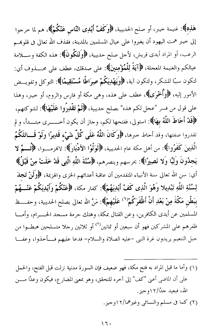 هَذِهِ): غنيمة خيبر، أو صلح الحديبية، (وَكَفَّ أَيْدِيَ النَّاسِ عَنْكُمْ)، هم لما خرجوا إلى خيبر همت اليهود أن يغيروا على عيال المسلمين بالمدينة، فقذف الله تعالى في قلوبهم الرعب، أو المراد أيدى قريش، لأجل صلح حديبية، (وَلِتَكُونَ): هذه الكفة وسلامة عيالكم والغنيمة المعجلة، (آيَةً لِلْمُؤْمِنِينَ): على صدقك، عطف على محذوف أي: لتكون سببًا للشكر، ولتكون آية، (وَيَهْدِيَكُمْ صِرَاطًا مُسْتَقِيمًا): التوكل وتفويض الأمور إليه، (وَأُخْرَى)، عطف على هذه، وهي مكة أو فارس والروم، أو خيبر، وهذا على قول من فسر " عجل لكم هذه " بصلح [الحديبية]، (لَمْ تَقْدِرُوا عَلَيْهَا): لشوكتهم، (قَدْ أَحَاطَ اللهُ بِهَا): استولى، ففتحها لكم، وجاز أن يكون أخرى مبتدأ، ولم تقدروا صفتها، وقد أحاط خبرها، (وَكَانَ اللهُ عَلَى كُلِّ شَيْءٍ قَدِيرًا وَلَوْ قَاتَلَكُمُ الَّذِينَ كَفَرُوا): من أهل مكة عام الحديبية، (لَوَلَّوُا الأدْبَارَ): لانهزموا، (ثمَّ لا يَجِدُونَ وَلِيًّا وَلا نَصِيرًا): يحرسهم وينصرهم، (سُنَّةَ اللهِ الَّتِي قَدْ خَلَتْ مِنْ قَبْلُ) أي: سن الله تعالى سنة الأنبياء المتقدمين أن عاقبة أعدائهم الخزي والهزيمة، (وَلَنْ تَجِدَ لِسُنَّةِ اللهِ تَبْدِيلًا وَهُوَ الَّذِى كَفَّ أَيْدِيَهُمْ): كفار مكة، (عَنْكُمْ وَأَيْدِيَكُمْ عَنْهُمْ بِبَطْنِ مَكَّةَ مِنْ بَعْدِ أَنْ أَظْفَرَكُمْ عَلَيْهِمْ): مَنَّ الله تعالى بصلح الحديبية، وحفظ المسلمين عن أيدي الكافرين، وعن القتال بمكة، وهتك حرمة [المسجد] الحرام، وأما ظفرهم على المشركين فهو أن سبعين أو ثمانين أو ثلاثين رجلاً متسلحين هبطوا من جبل التنعيم يريدون غرة النبي - عليه الصلاة والسلام - فدعا عليهم فأخذوا، وعفا